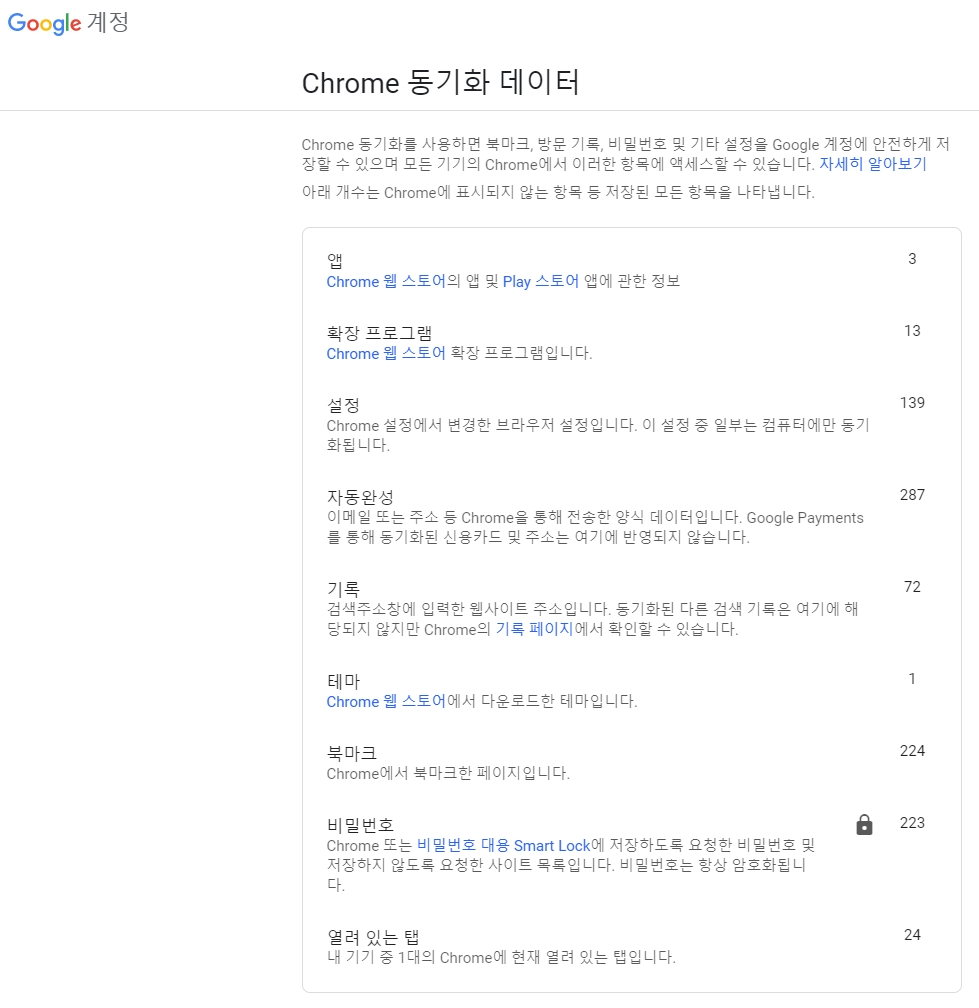 3-3. Chrome 동기화 데이터 항목도 클릭하면 새창으로 이동하며 구글 계정의 Chrome 동기화 데이터 항목으로 연결됩니다. 여기에는 이용자가 크롬 동기화를 설정한 경우 구글 서버에 저장되는 동기화 항목들이 일목요연하게 정리되어 있습니다. 각 항목별로 몇 가지가 저장되어 있는지를 알려주지만 개별 항목을 보여주는 기능은 없습니다.