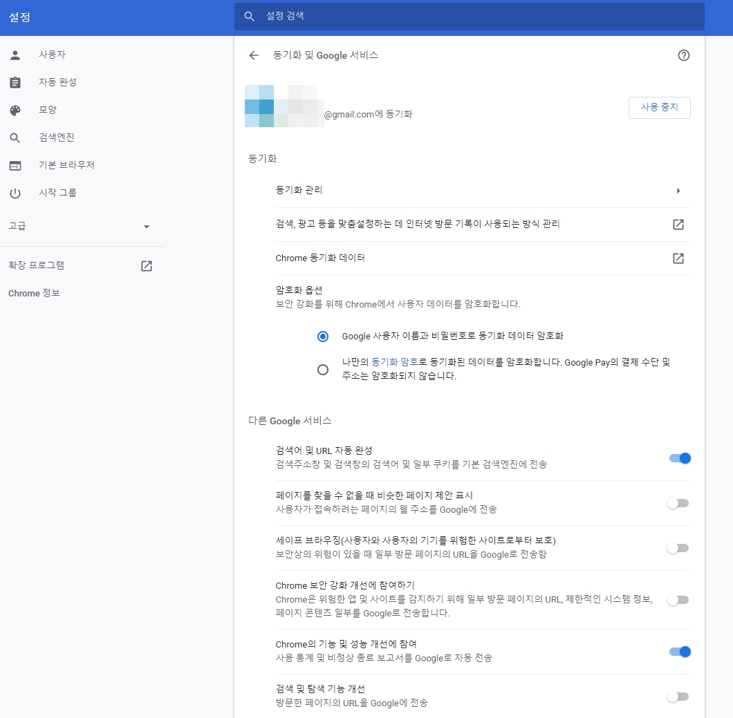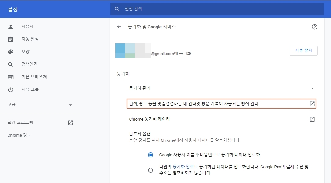 3. 동기화 및 Google 서비스로 진입하면 동기화 관련 다양한 설정이 가능합니다. 동기화 관련 설정 항목은 크게 동기화 관리 / 검색, 광고 등을 맞춤설정하는데 인터넷 방문 기록이 사용되는 방식 관리 / Chrome 동기화 데이터 / 암호화 옵션의 네 가지로 나누어집니다.