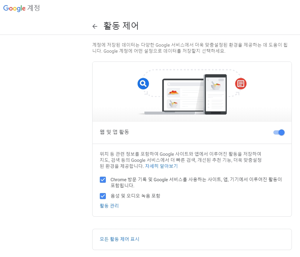 3-2. 검색, 광고 등을 맞춤설정하는데 인터넷 방문 기록이 사용되는 방식 관리 항목을 클릭하면 새창으로 이동하며 구글 계정의 활동 제어 항목으로 연결됩니다. 웹 및 앱 활동 전반에서 이용자가 Chrome 방문 기록 및 Google 서비스를 사용하는 사이트, 앱, 기기에서 이루어진 모든 활동이 포함됩니다. 심지어 음성 및 오디오 녹음도 포함되기 때문에 이렇게 모든 정보를 제공하는 것에 다소 민감한 분들이라면 해당 옵션은 꺼주시는 것이 좋습니다.