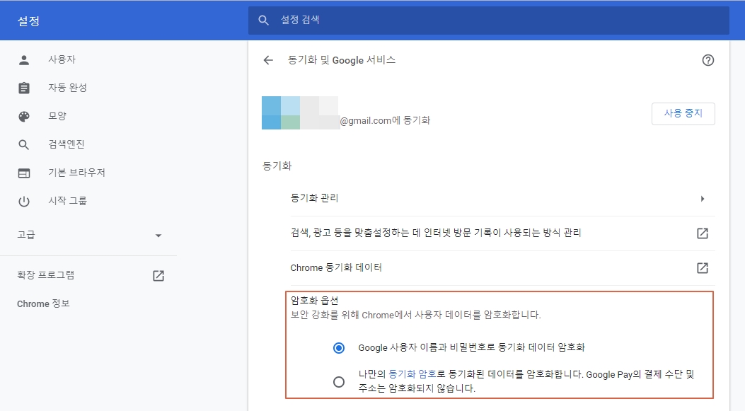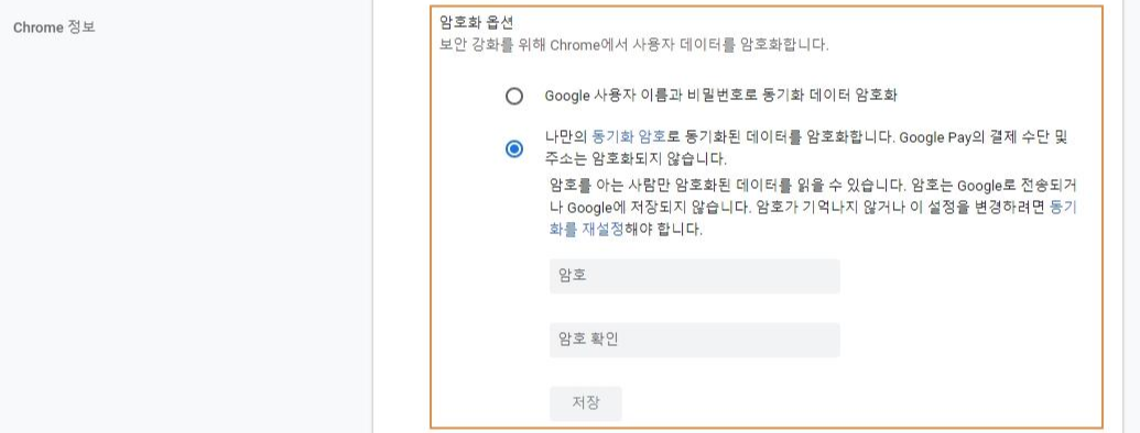 3-4. 암호화 옵션에서는 보안 강화를 위해 크롬에서 사용자 데이터를 암호화하여 관리하는 것을 설정합니다. 이용자는 Google 사용자 이름과 비밀번호로 동기화 데이터 암호화 또는 나만의 동기화 암호로 동기화된 데이터 암호화 두 가지 옵션 중 하나를 선택할 수 있습니다. 나만의 동기화 암호를 설정하는 경우 구글 페이의 결제 수단 및 주소는 암호화되지 않으며 암호를 아는 사람만 해당 데이터에 접근할 수 있고 암호는 구글로 전송되거나 저장되지 않습니다.