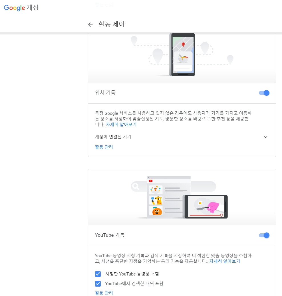 또한 모든 항목 제어 표시를 누르면 위치 기록 / Youtube 기록도 설정할 수 있습니다. 우리가 유튜브를 통해 동영상을 볼수록 추천 동영상, 연관 동영상이 더욱 정확하게 나타나는게 바로 여기서 구글이 우리의 시청 정보를 수집 및 분석하기 때문입니다. 해당 옵션도 원치 않으면 끌 수 있습니다.