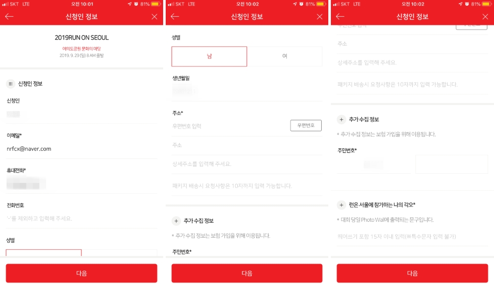 4. 패키지 선택 다음은 신청인 정보 입력입니다. 여기서 입력해야할 정보는 이름, 이메일, 휴대전화, 전화번호, 성별, 생년월일, 주소, 주민번호(보험 가입을 위해 필요), 그리고 런온 서울에 참가하는 나의 각오입니다. 특히 런온 서울에 참가하는 나의 각오는 대회 당일 Photo Wall에 출려되는 문구라고 하니 신중하게 입력하시기 바랍니다. (대회 당일에 보니 이 문구는 즉석에서 변경이 가능합니다. 크게 신경쓰지 않으셔도 됩니다.)