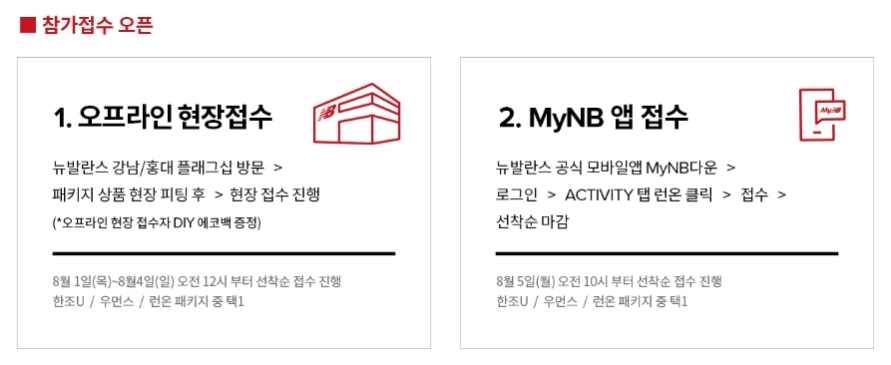 뉴발란스 런온 서울 2019 접수는 오프라인 / 온라인 모두 가능합니다. 오프라인 접수의 경우 뉴발란스 강남/홍대 플래그십 매장에 방문하여 패키지 상품을 직접 입어본 다음 현장 접수 진행이 가능합니다. 접수 기간은 8월 1일(목)부터 8월 4일(일)까지입니다. 온라인 접수는 MyNB 앱을 통해 가능합니다. 아래에서는 앱을 이용한 접수 방법을 알려드리도록 하겠습니다.