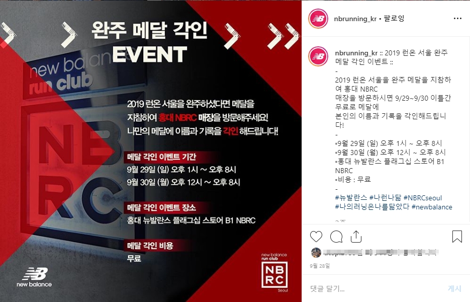 인스타그램 뉴발란스러닝 (@nbrunning_kr) 을 보시면 더 자세한 내용이 나와있습니다. 완주 메달 각인 이벤트는 홍대 뉴발란스 플래그십 스토어 B1 NBRC, 즉 new balance run club에서 진행하는데 이 곳에서만 완주 메달 각인이 가능합니다. 올해는 런온 서울 당일인 9월 29일 오후 1시~오후 8시, 다음날인 9월 30일 오후 12시~오후 8시까지만 각인 이벤트를 진행했습니다. 비용은 무료입니다.