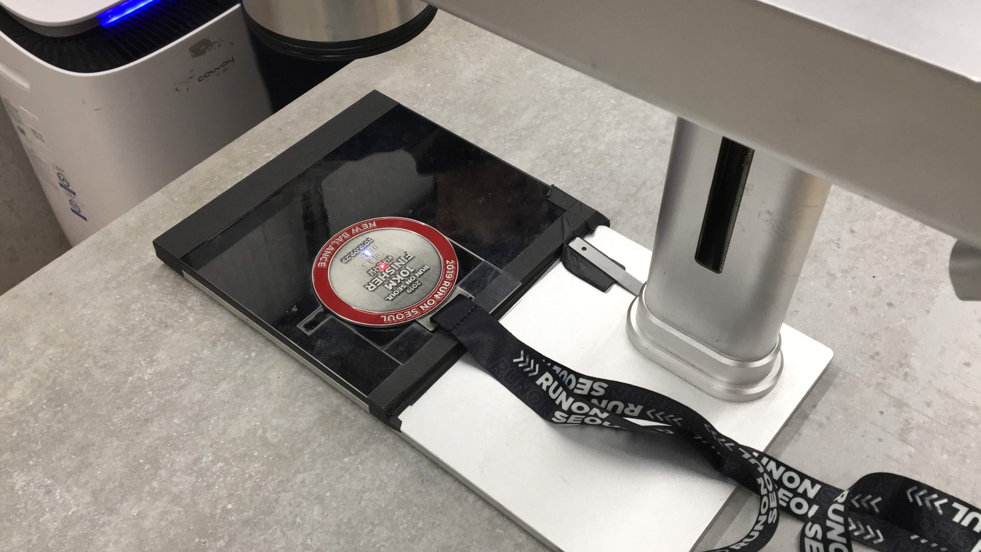 잠시 동안의 기다림이 지나고 드디어 제 차례가 왔습니다. 우선 메달을 스텝분에게 드리면, 참가자 이름만 말씀드리면 알아서 기록을 검색해서 입력해 주십니다. 그 다음 각인 기계에 메달을 잘 고정하고, 약 15초 정도 기다리면 메달 아랫쪽 비어있는 부분에 이름, 기록이 각인되는 방식입니다.