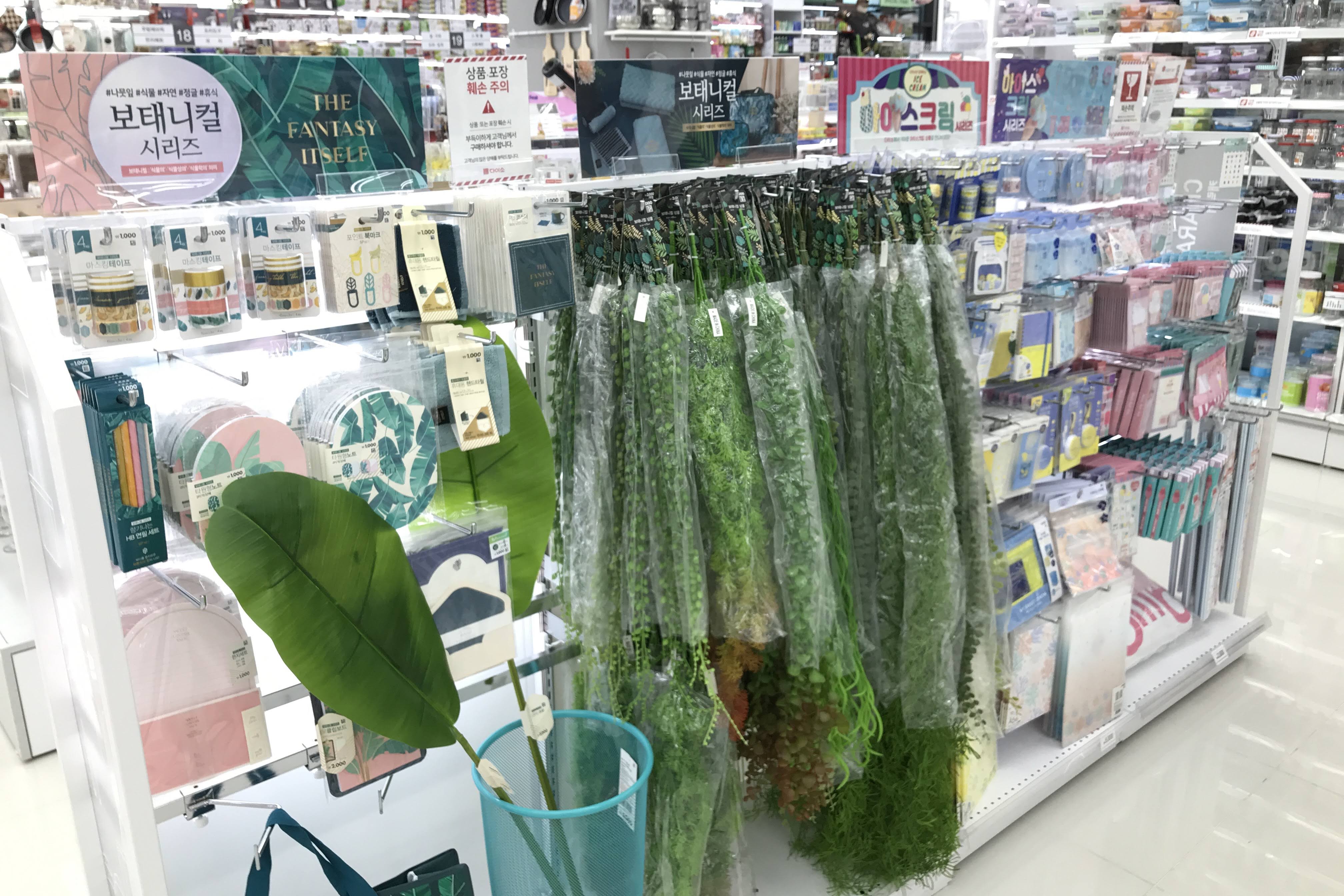 우선 규모가 좀 큰 다이소 매장에서만 보던 시리즈 제품군이 있었습니다. 색상이 비슷한 제품군을 한 곳에 모아놓은 코너입니다. 제가 찍어본 건 보태니컬시리즈인데요, 조화가 대부분이라서 크게 구미가 당기진 않았습니다.