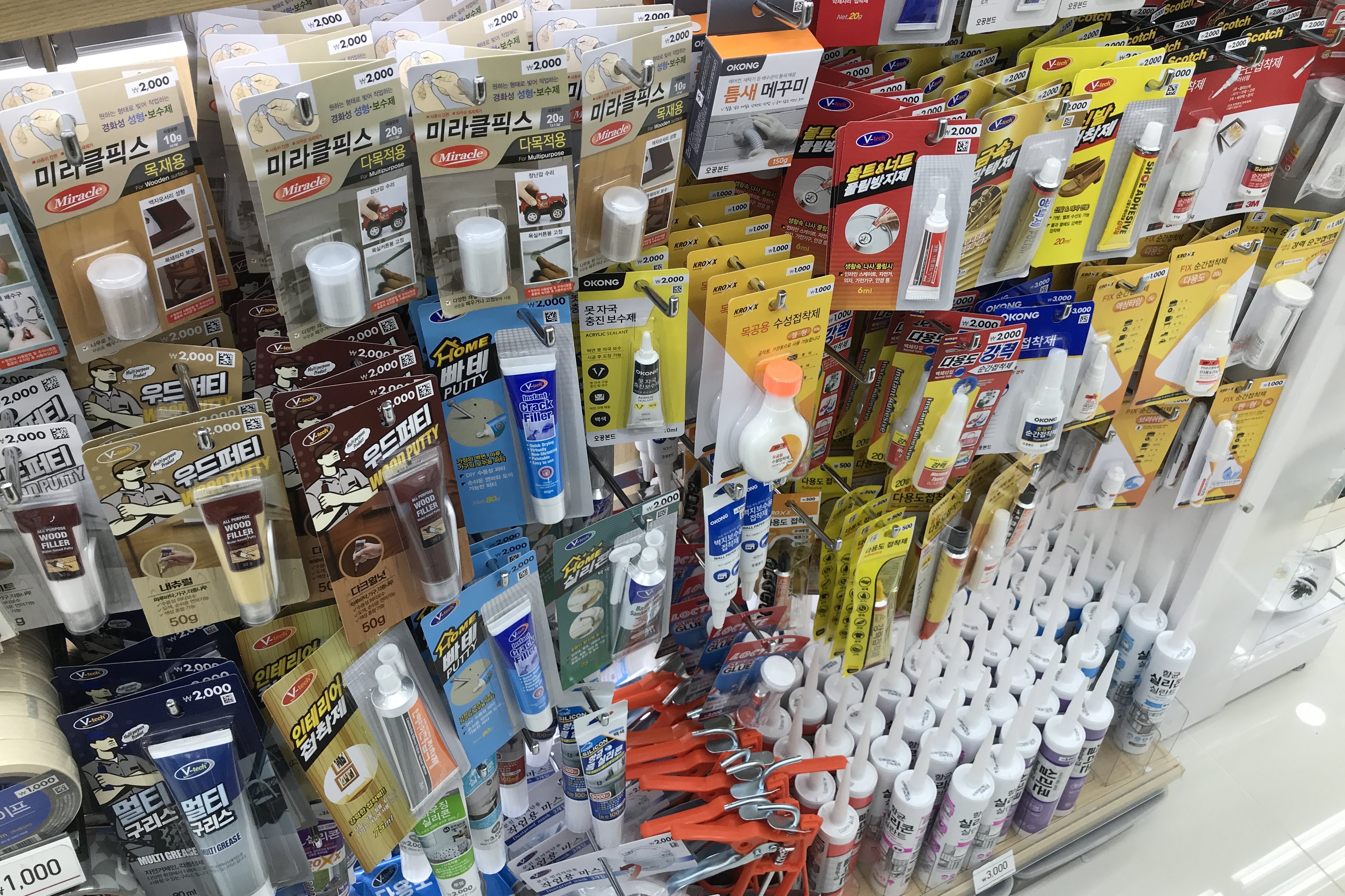 공사장 및 가정에서 각종 보수를 하는데 필요한 물건도 다양하게 준비되어 있습니다. 이 정도면 어지간한 철물점 부럽지 않은 구성인데요. 우선 가장 먼저 눈에 띈 것은 평소에도 현장에서 자주 사용하는 실리콘이었습니다. 어지간한 마트에서도 잘 판매하지 않는 실리콘을 다이소에서 보다니 뭔가 낯설면서도 반가웠습니다.