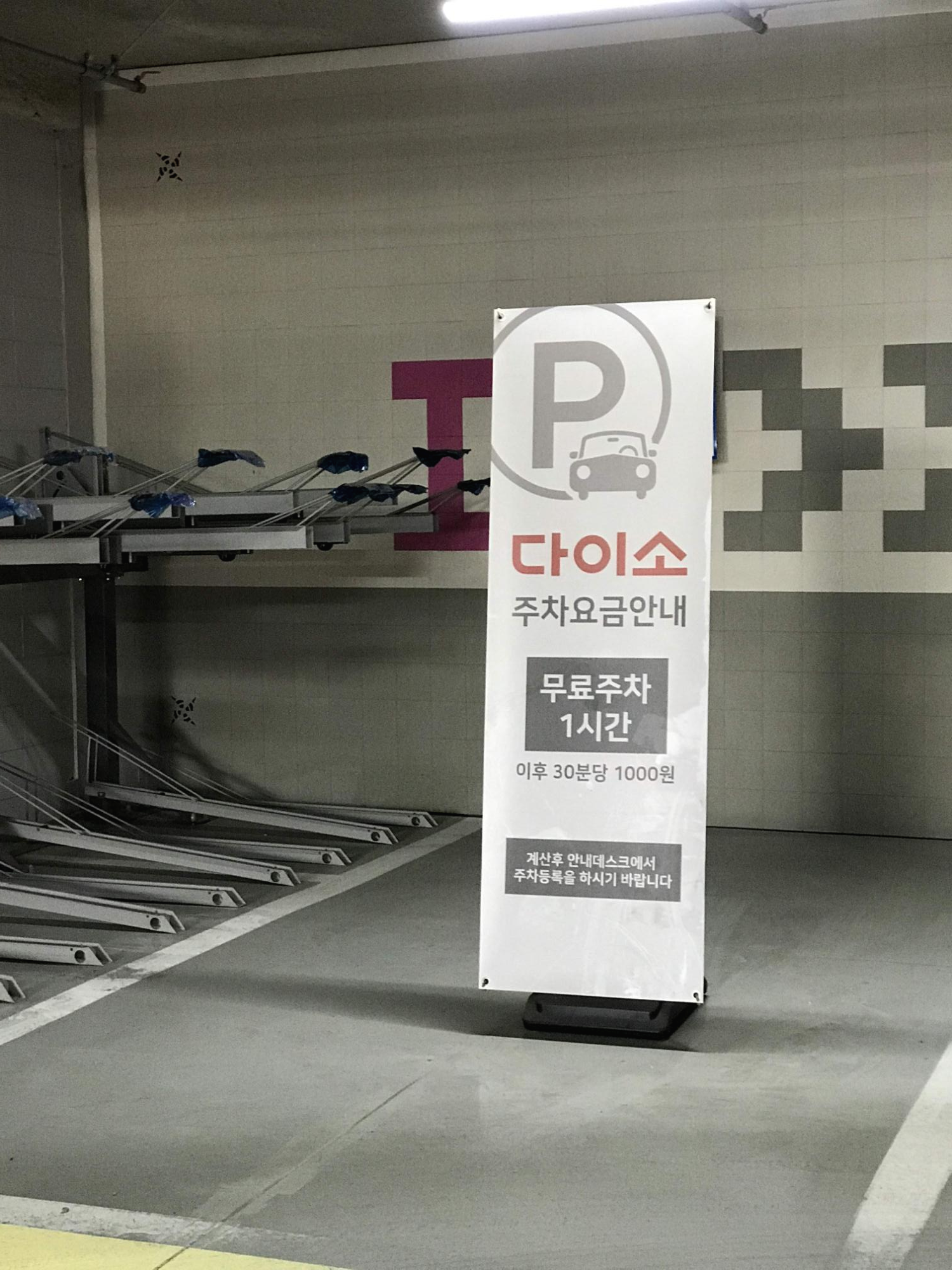 건물 지하주차장에 들어서면 다이소 주차요금안내판이 있습니다. 무료주차가 무려 1시간이나 주어집니다. 식당이나 다른 업종이었으면 턱없이 부족한 시간이지만 다이소에서 충분히 구경하면서 물건을 사는데는 충분합니다.
