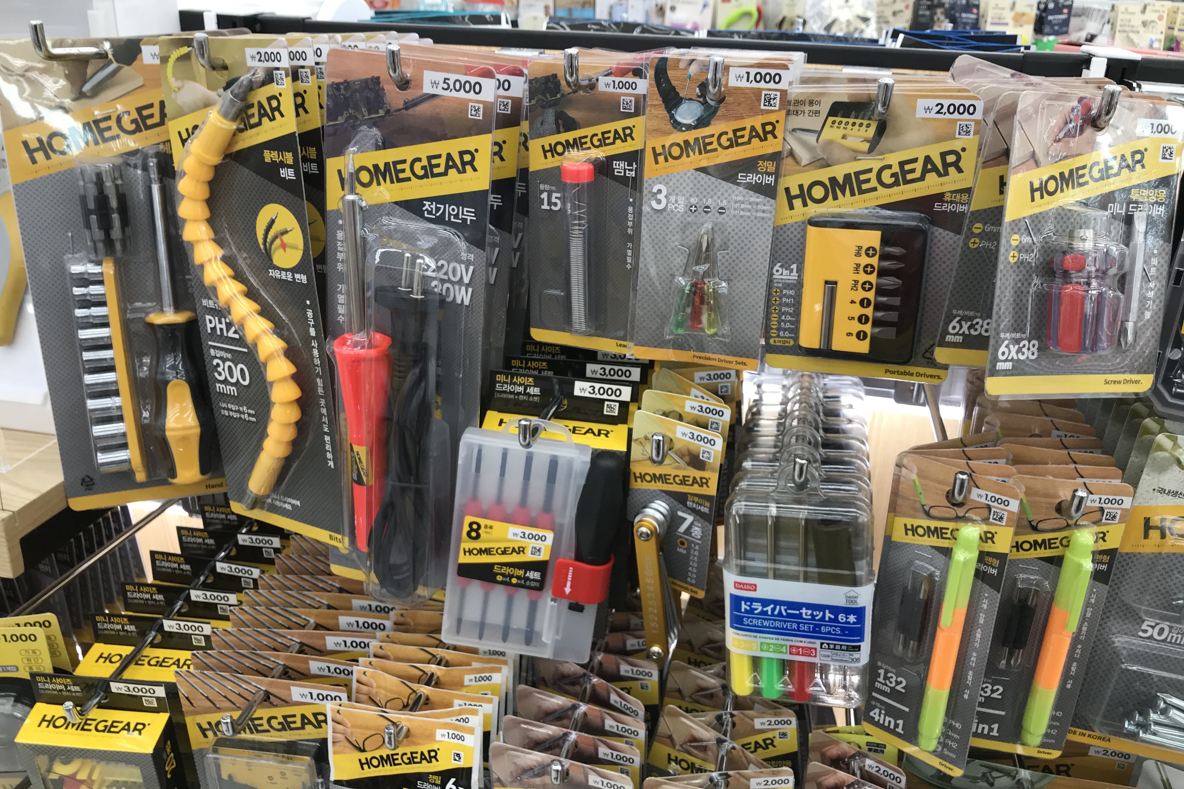 다이소의 공구 브랜드가 아마 'HOME GEAR'인 것 같습니다. 생각보다 다양한 종류의 용품이 판매 중이어서 한 장 찍어보았습니다. 저 중에서 일부는 용도를 알기 어려운 제품들도 있네요. 그만큼 많은 종류의 공구류가 갖춰져 있다고 보시면 됩니다.