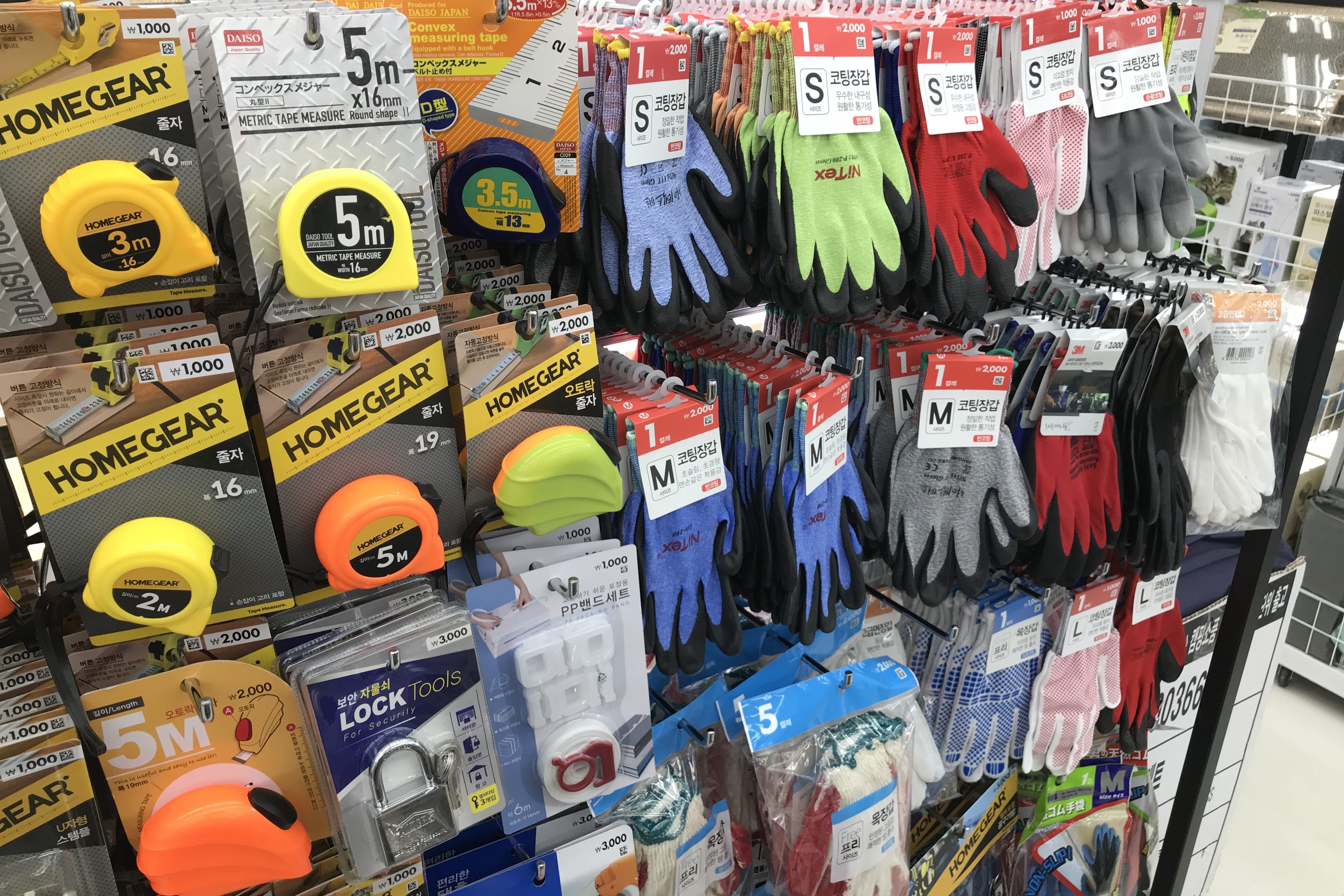 공사 부자재류 이외에도 줄자, 장갑, 자물쇠 등 공사에 필요한 다양한 물건들도 판매 중입니다. 줄자의 경우 국산이 아니라 일본산도 있었습니다. 개인적인 경험으로 비춰볼 때 줄자는 가격만큼의 내구성을 보여주는 카테고리라 다이소에서는 잘 구매하지 않는 편입니다.