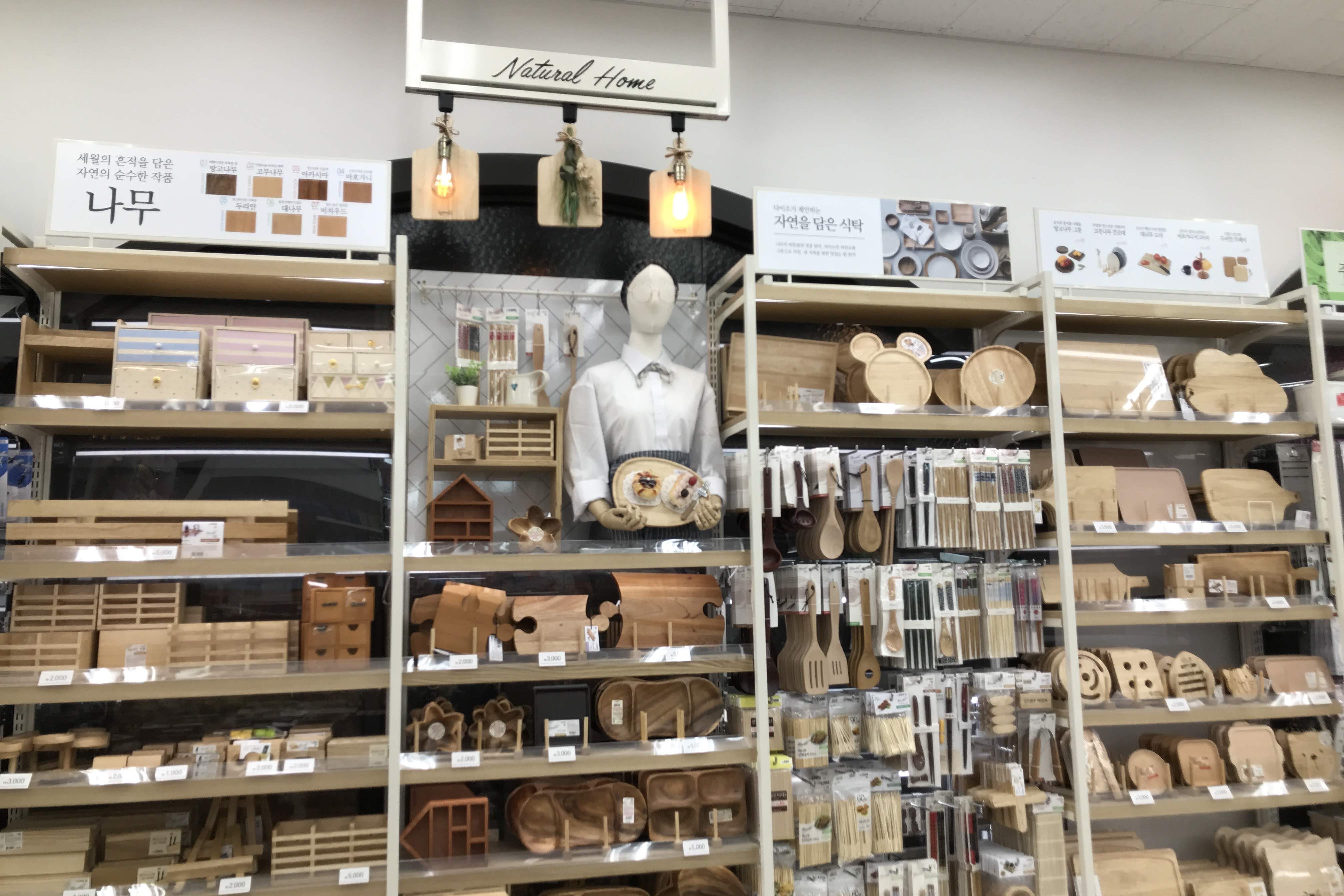 나무를 이용한 다채로운 소품이 가득한 코너입니다. 주방용품이 주를 이루고 수납함이나 쟁반 및 기타 나무로 만든 여러가지 물품을 한 곳에 모아놓고 판매 중이었습니다. 최근 다이소 매장에 가면 이렇게 하나의 테마를 가지고 모아놓은 코너를 쉽게 만날 수 있는데, 이 곳은 규모가 크다보니 앞서 보여드린 보태니컬 시리즈 외에도 이런 코너가 여러군데 있었습니다.