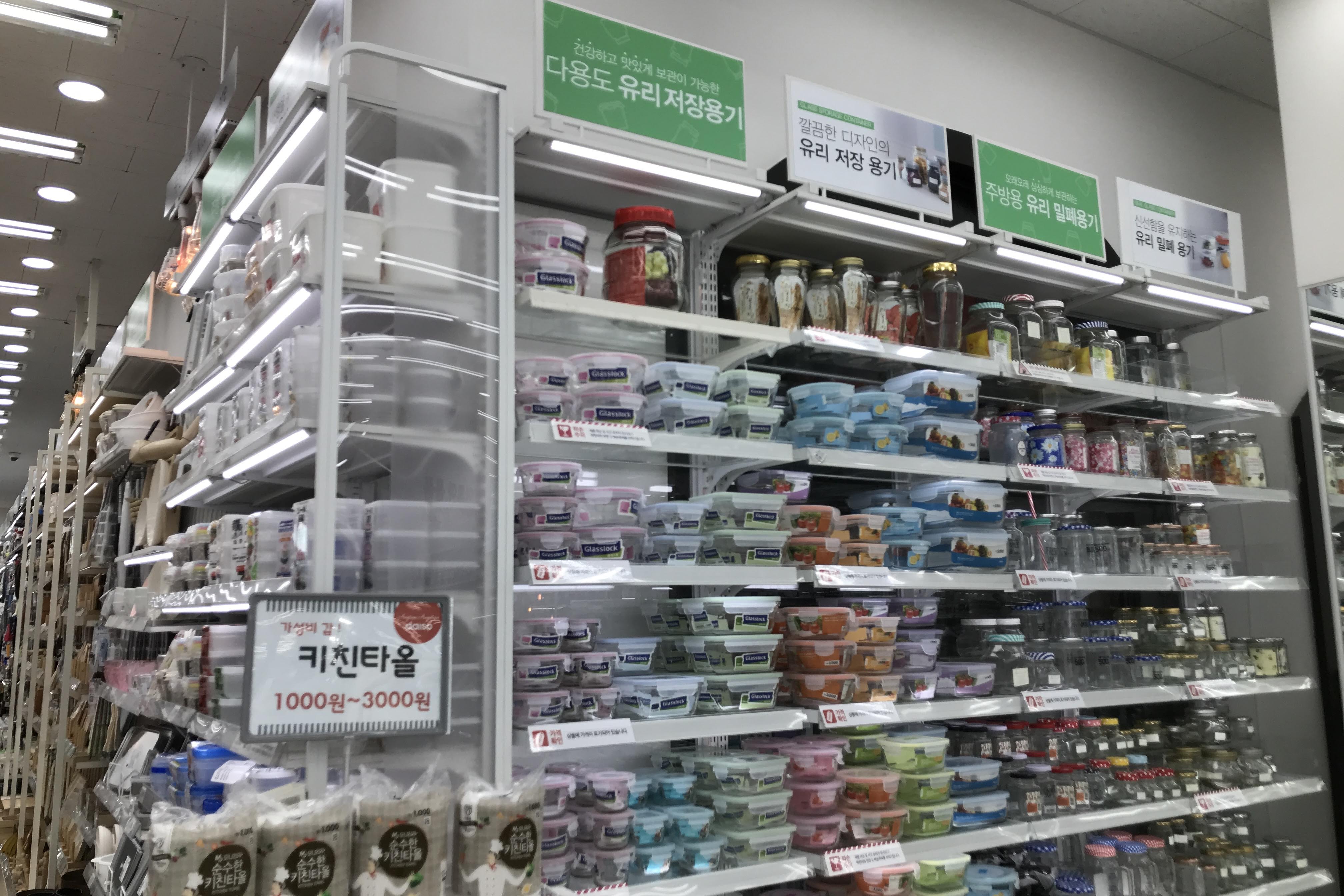 주방용품 코너에는 다양한 유리, 플라스틱 용기를 판매 중이었습니다. 중간에 전자레인지 용품들도 있었는데 상품보다 함께 진열된 모형 전자레인지가 더 탐나더군요. 뭔가 어릴 적에 갖고 놀던 장난감 같은 외형이 제 마음에 쏙 들었습니다.