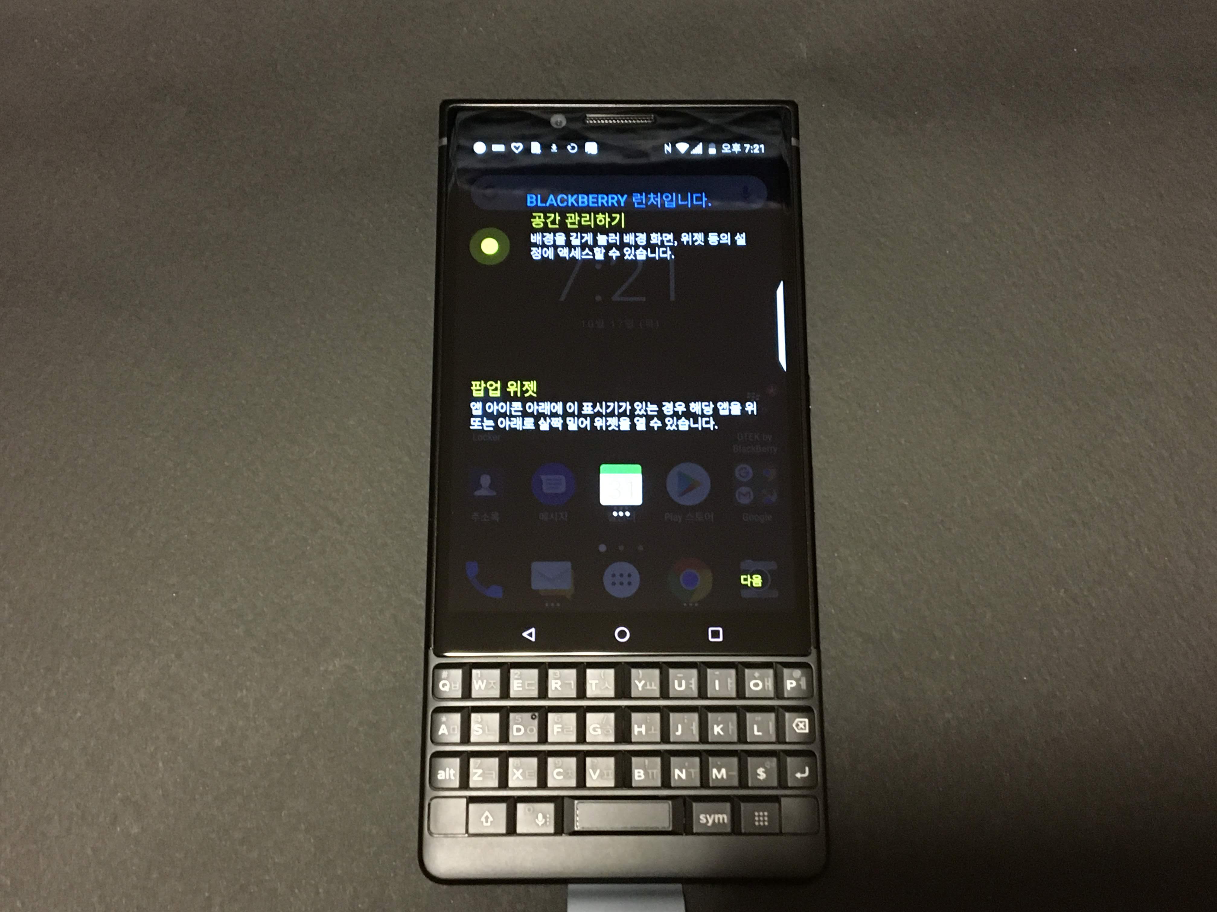 초기 설정에서 한 가지 아쉬운 점은 한/영 전환이 어렵다는 점이었습니다. 블랙베리의 키투는 설정에서 통화($) 키를 한/영 전환키로 설정하여 사용할 수 있지만, 초기 설정시에는 기본 설정인 alt+엔터로 되어 있어서 와이파이 비밀번호 입력부터 막혔던 경험을 해야했습니다. 게다가 한/영 전환에 대한 어떤 설명도 나오지 않아 한참을 헤맨 끝에 겨우 방법을 찾았습니다. 외산폰이기 때문에 이런 소소한 부분에 아쉬운 점이 있는 건 감수해야 하지만 가장 기본적인 설정에서 막히는 부분은 이해하기 어려웠습니다.