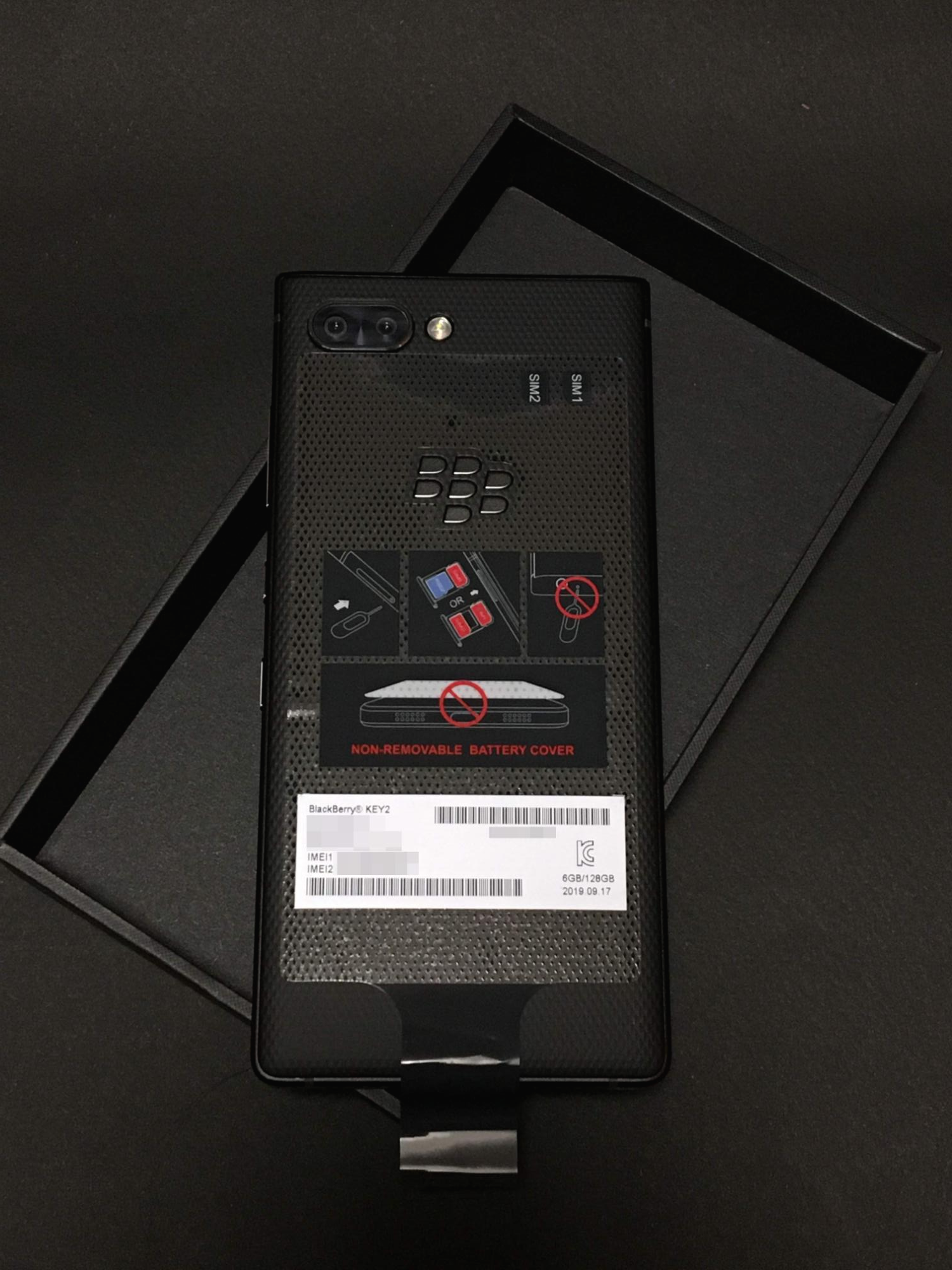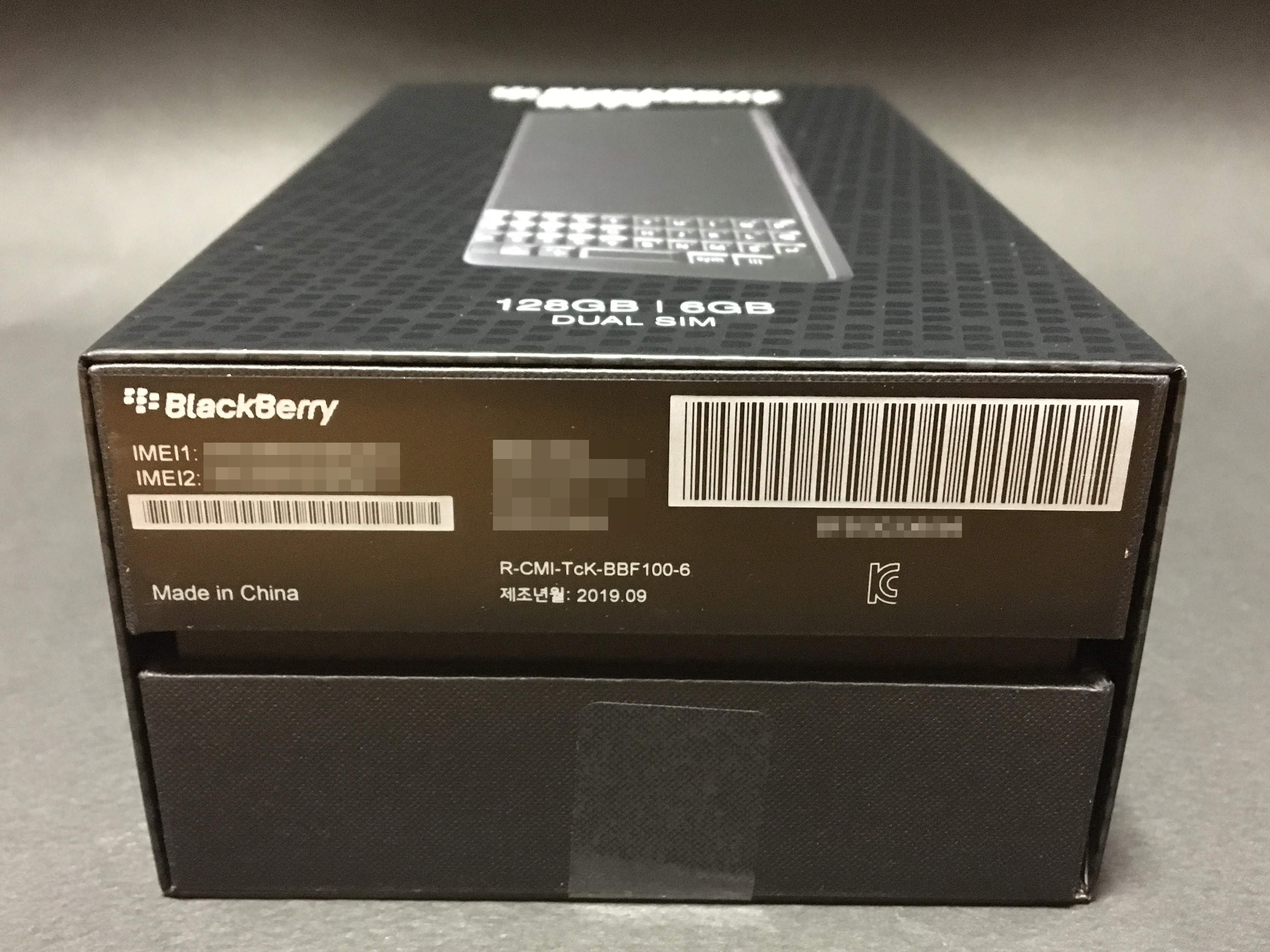 하단에는 바코드 및 IMEI 코드 등이 인쇄되어 있습니다. 참고로 블랙베리 키투 국내 정식발매판은 듀얼심 모델이기 때문에 IMEI 코드도 두개입니다. 만약 SKT등에 외산 기기 등록을 할 경우, 유심1과 유심2의 IMEI 모두 등록해야 유심을 옮겨가며 사용이 가능합니다. 제조년월 또한 기재되어 있는데, 제가 받은 제품은 2019년 9월 생산품입니다. 한동안 헬로모바일에서 블랙 모델이 일시품절이었는데, 최근에 추가 생산품을 들여온 것으로 보입니다.