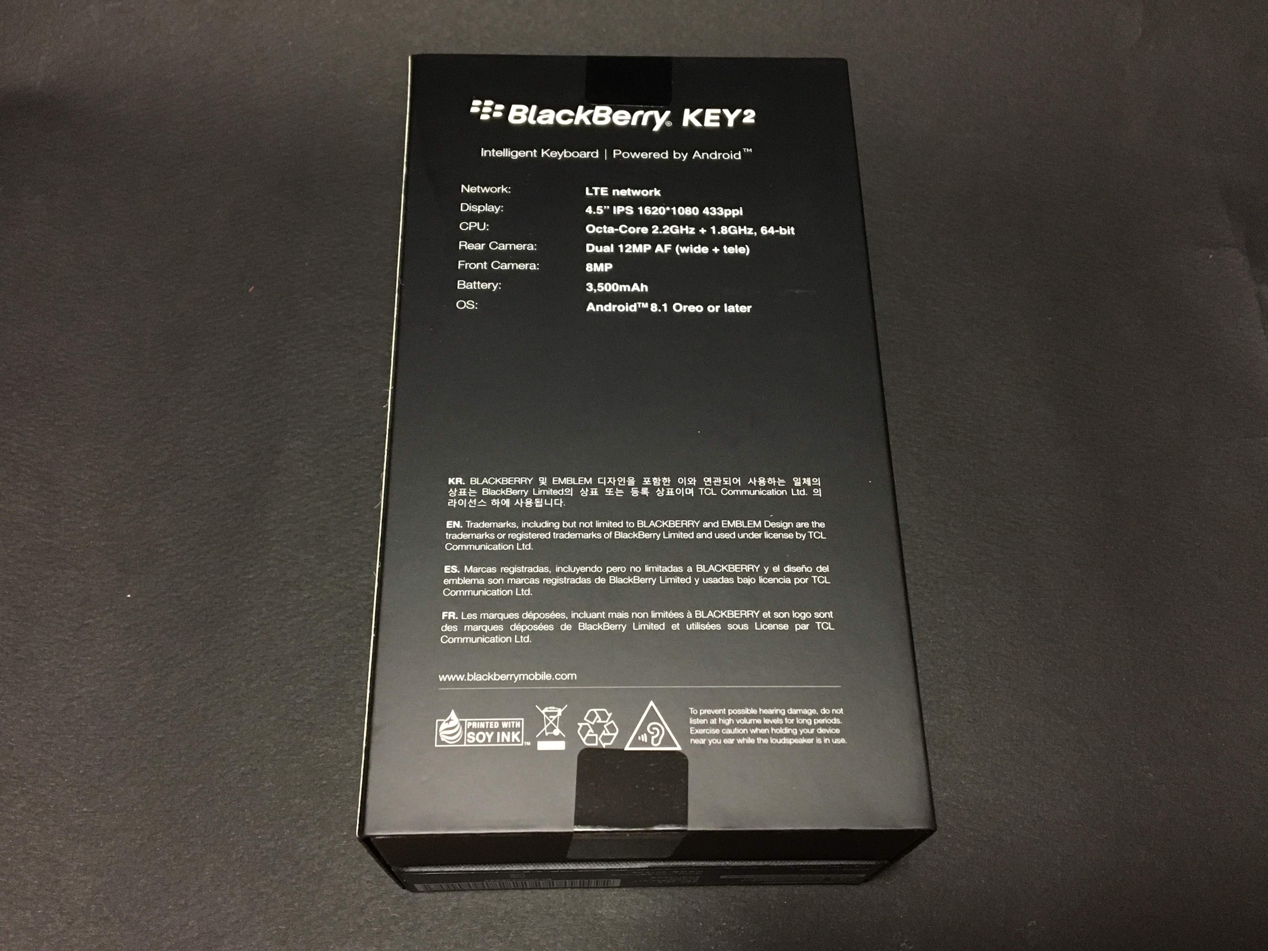 블랙베리 키투 박스를 검은 배경에 올려놓고 제품 앞면을 찍어보았습니다. 배경은 전부터 포스팅 용으로 준비해 둔 검은색 종이인데요. 키투는 검은색이라서 배경에 묻히지 않을까 살짝 걱정했는데 오히려 고고한 멋을 뽐내더군요. 아무래도 제 눈에 콩깍지가 씌인 듯 합니다. 앞면에는 블랙베리 키투의 사진과 함께 128GB ram/6GB rom 그리고 DUAL SIM이 씌여있습니다.