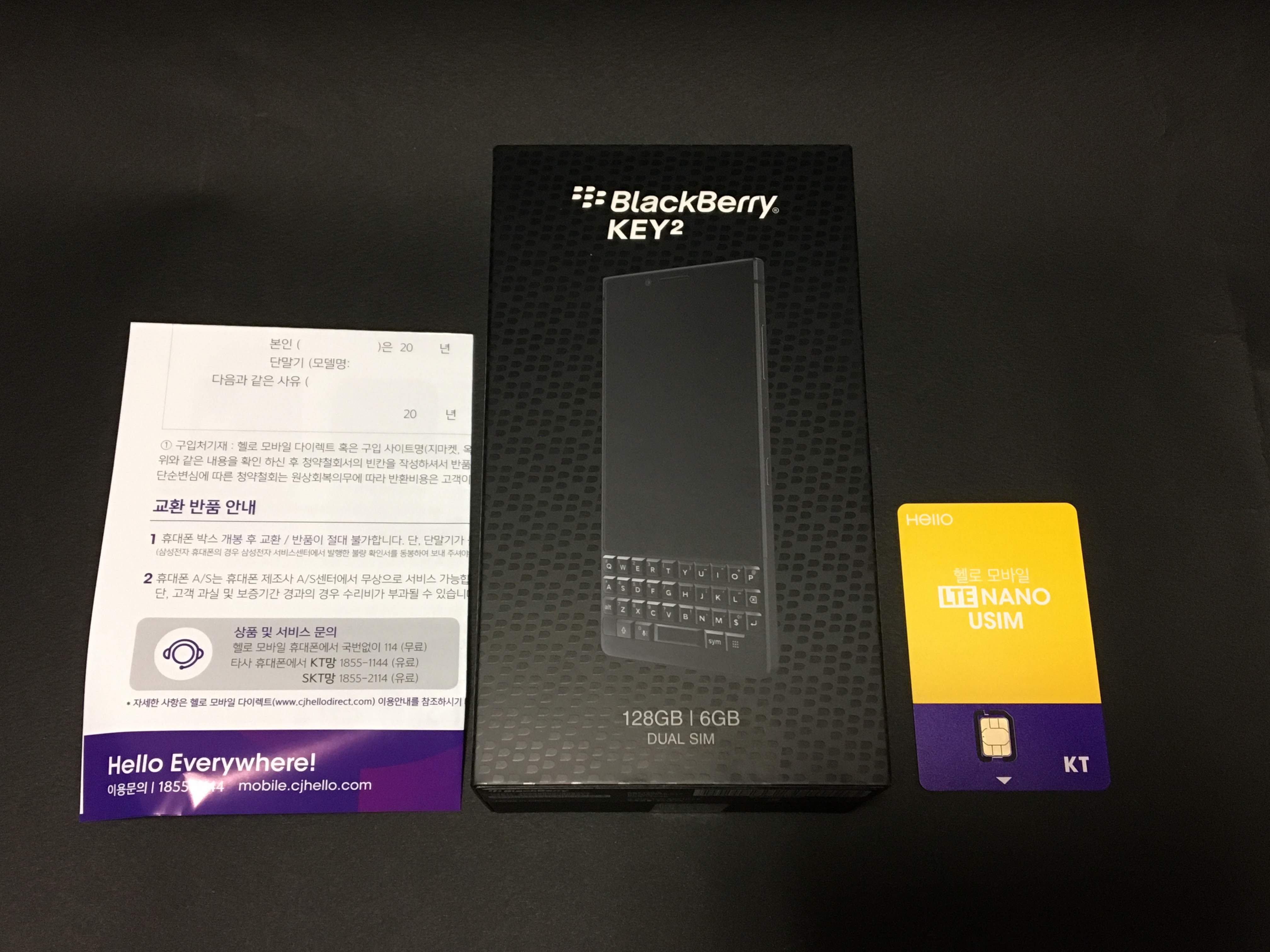 뽁뽁이에 단단히 쌓여있던 내용물들을 꺼내보았습니다. 왼쪽에서부터 헬로모바일 가입 안내서, 블랙베리 키투, 헬로모바일 유심입니다. 매번 헬로모바일 유심을 볼 때마다 느끼지만 개나리 빛 노란색과 푸르스름한 보라색의 조화가 인상적입니다.