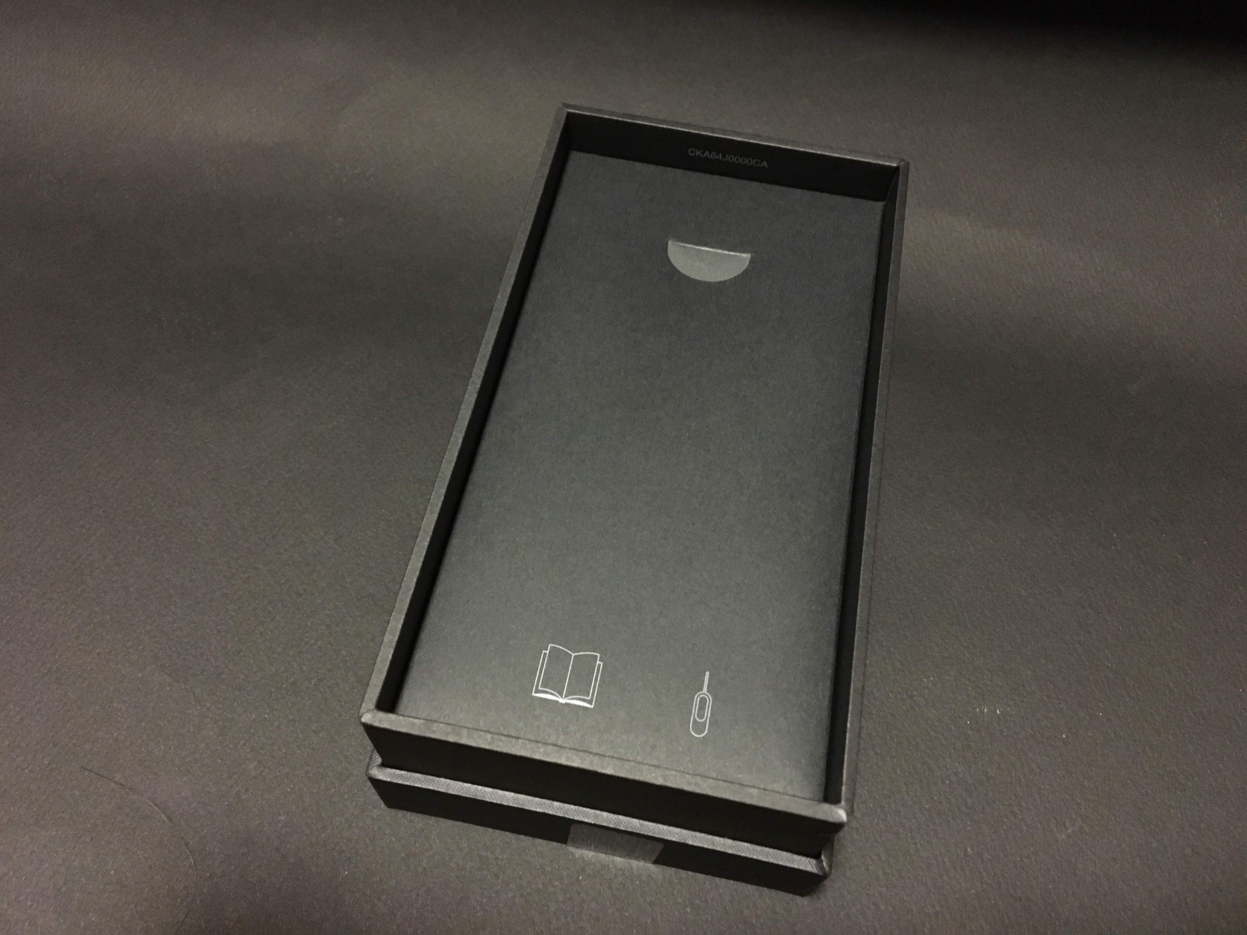 겉을 둘러싼 종이패키지를 벗겨내면 마침내 본 상자가 모습을 드러냅니다. 블랙베리 마크와 모델명이 양각으로 새겨져 있어 고급스러운 느낌을 전달합니다.