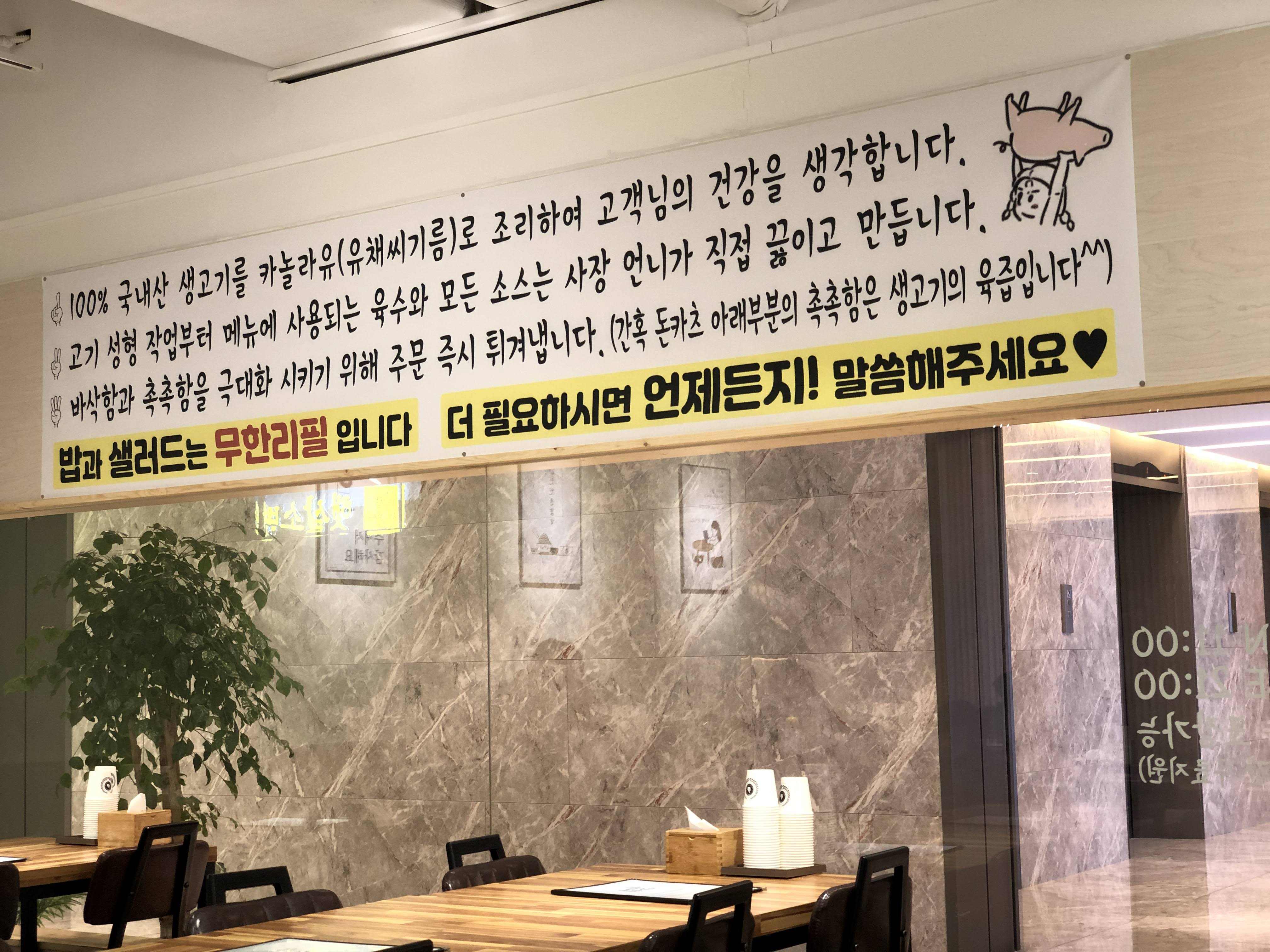 오네짱돈카츠의 메뉴판에는 아까 현수막에서 봤던 운영 방침이 그대로 적혀있습니다. 이처럼 각 식당마다 저마다의 이야기를 담아 놓은 것이 메뉴판이라고 할 수 있습니다. 그러므로 메뉴 주문 후 잠깐 동안의 틈이 있을 경우 천천히 메뉴판을 보며 눈으로 맛을 음미하는 것을 추천드리는 바입니다.
