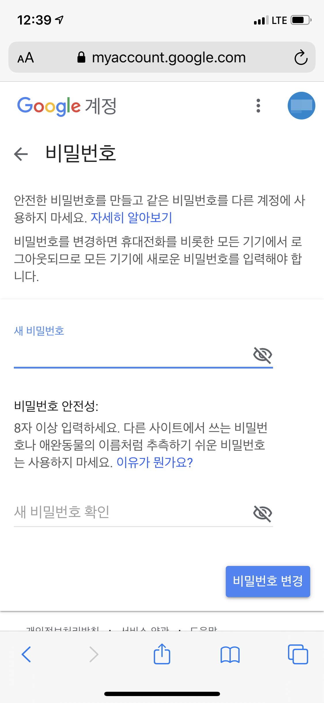 새 비밀번호 입력에 대한 구글의 힌트는 다음과 같습니다. 먼저, 안전한 비밀번호를 만들고 같은 비밀번호를 다른 계정에서 사용하지 말 것을 추천합니다. 한 번 비밀번호가 뚫리면 다른 계정까지 연쇄적으로 뚫리는 것을 막기 위함입니다. 다음으로 8자 이상의 비밀번호를 사용합니다. 비밀번호가 어렵고 길수록 해커 입장에선 알아내기 어렵기 때문입니다. 마지막으로 다른 사이트 또는 평소 자주 쓰는 단어를 사용하지 않습니다. 사용자를 잘 아는 사람이라면 평소 다른 사이트의 비밀번호나 비밀번호로 자주 사용하는 단어를 알 수도 있기 때문입니다.