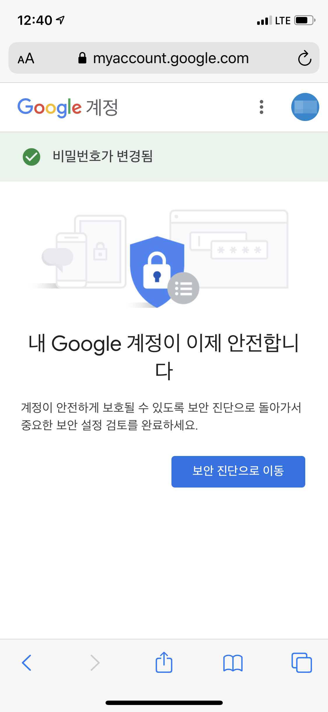 계정을 안전하게 보호하기라는 페이지로 넘어왔습니다. 알 수 없는 활동으로 다른 사람이 내 비밀번호를 도용했을 가능성이 있다고 알려주네요. 여기서 비밀번호를 한 번 변경해주면 현재 사용 중인 기기를 제외한 모든 기기에서 로그아웃되기 때문에 혹시 모를 2차, 3차 도용의 우려도 없앨 수 있습니다. 비밀번호 변경 과정은 평소와 크게 다르지 않습니다. 현재 비밀번호를 입력한 다음, 새로 지정할 비밀번호를 입력해주면 됩니다. 기존에 사용하던 비밀번호와는 최대한 다른 패턴을 가진 어려운 비밀번호로 설정해주면 더욱 좋겠죠.