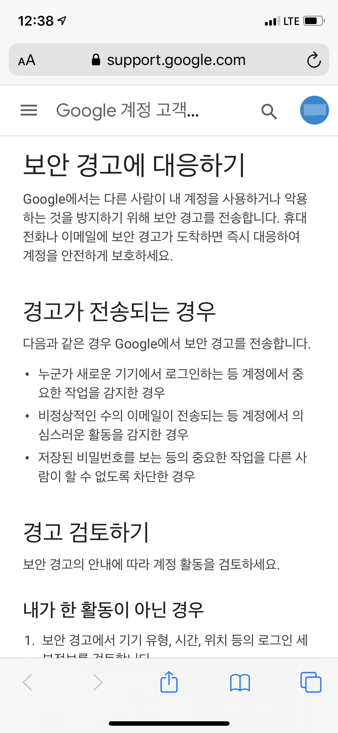문자메시지 링크를 클릭하니 구글 계정 고객센터로 연결되었습니다. 내용은 보안 경고에 대응하기 라는 제목의 안내문입니다. 이 글에 따르면 구글에서는 다른 사람이 내 계정을 사용하거나 악용하는 것을 방지하기 위해 보안 경고를 전송한다고 합니다. 또한 보안 경고는 누군가 새로운 기기에서 로그인하는 등 계정에서 중요한 적업을 감지한 경우, 비정상적인 수의 이메일이 전송되는 등 계정에서 의심스러운 활동을 감지한 경우, 저장된 비밀번호를 보는 등의 중요한 작업을 다른 사람이 할 수 없도록 차단한 경우 발송됩니다. 저에게 온 문자메시지는 아마도 누군가 새로운 지역에서 새로운 기기로 로그인하려 하는 경우여서 발송된 것으로 보입니다. 안내문에는 구글 보안경고를 검토하고 어떻게 대응해야 하는지에 대한 설명도 포함되어 있습니다. 우선 이용자가 한 활동이 아닌 경우 보안 경고에서 기기 유형, 시간, 위치 등의 로그인 세부정보를 검토하고 모르는 활동인 경우 내가 한 활동이 아님을 확인하고 이용자의 구글 계정에서 계정 보안을 강화합니다. 반대로 내가 한 활동인 경우 보안 경고에서 기기 유형, 시간, 위치 등의 로그인 세부정보를 검토하고 내가 한 활동이 확실함을 확인해주면 됩니다.