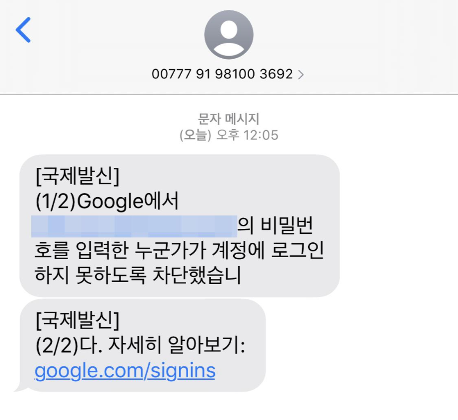 구글 보안경고의 작동 과정은 다음과 같습니다. 사용자가 비밀번호를 입력할 때 평소와 너무 멀리 떨어진 곳인 경우 비밀번호를 입력한 사람의 로그인을 우선 차단한 다음, 사용자 정보에 등록된 휴대전화로 문자메시지를 보냅니다. 문자메시지의 내용은 위와 같이 구글에서 계정 비밀번호를 입력한 누군가가 계정에 로그인 하는 것을 차단했다는 내용이며, 그 다음 문자에 해당 내용에 대한 링크를 확인하라는 것입니다. 즉 평소 계정 소유자가 머물지 않는 곳에서 로그인 시도가 있었다는 뜻이므로 조금 더 자세한 내용 확인을 해볼 필요가 있습니다.