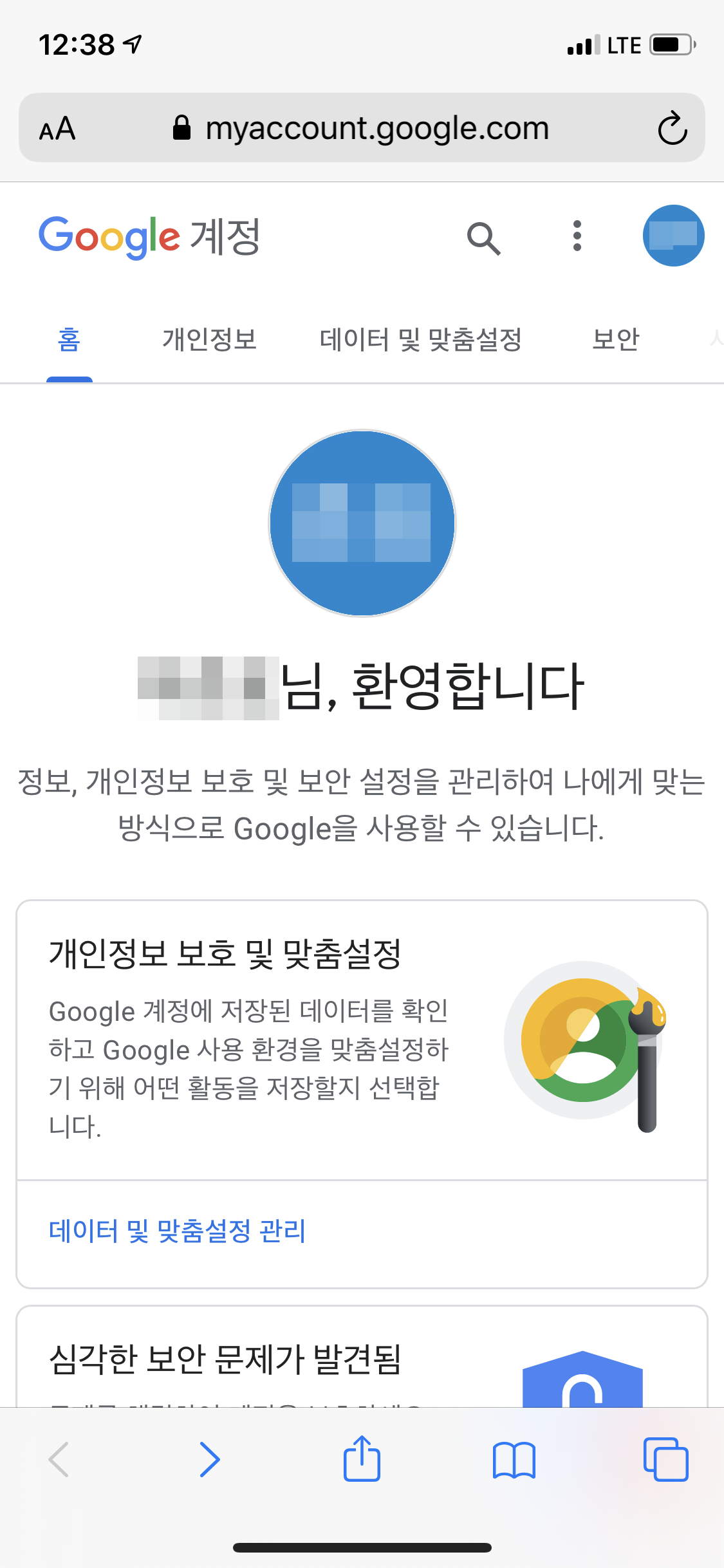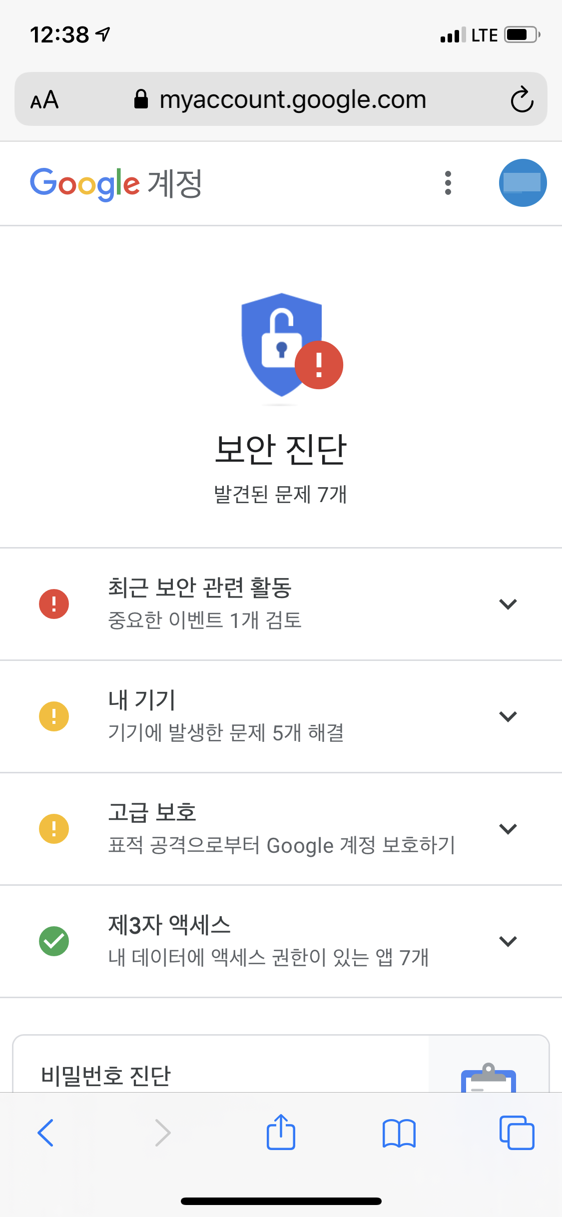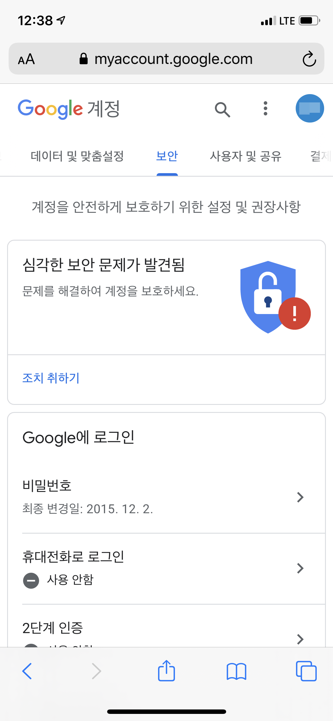 구글 보안경고에서 내 계정이 탈취 당하는 것을 막아주었으니 이제 다음 단계를 진행할 차례입니다. 계정 보안 강화를 위해 안내문 중간에 있는 링크 또는 myaccount.google.com 으로 이동하여 내 구글 계정 정보를 확인합니다. 그 다음, 보안 탭을 누르면 계정에서 심각한 보안 문제가 발견되었다는 메시지가 보입니다. 심각한 보안 문제가 발견됨 글씨 밑에 있는 조치 취하기를 클릭하면 계정 보안 설정이 가능합니다.