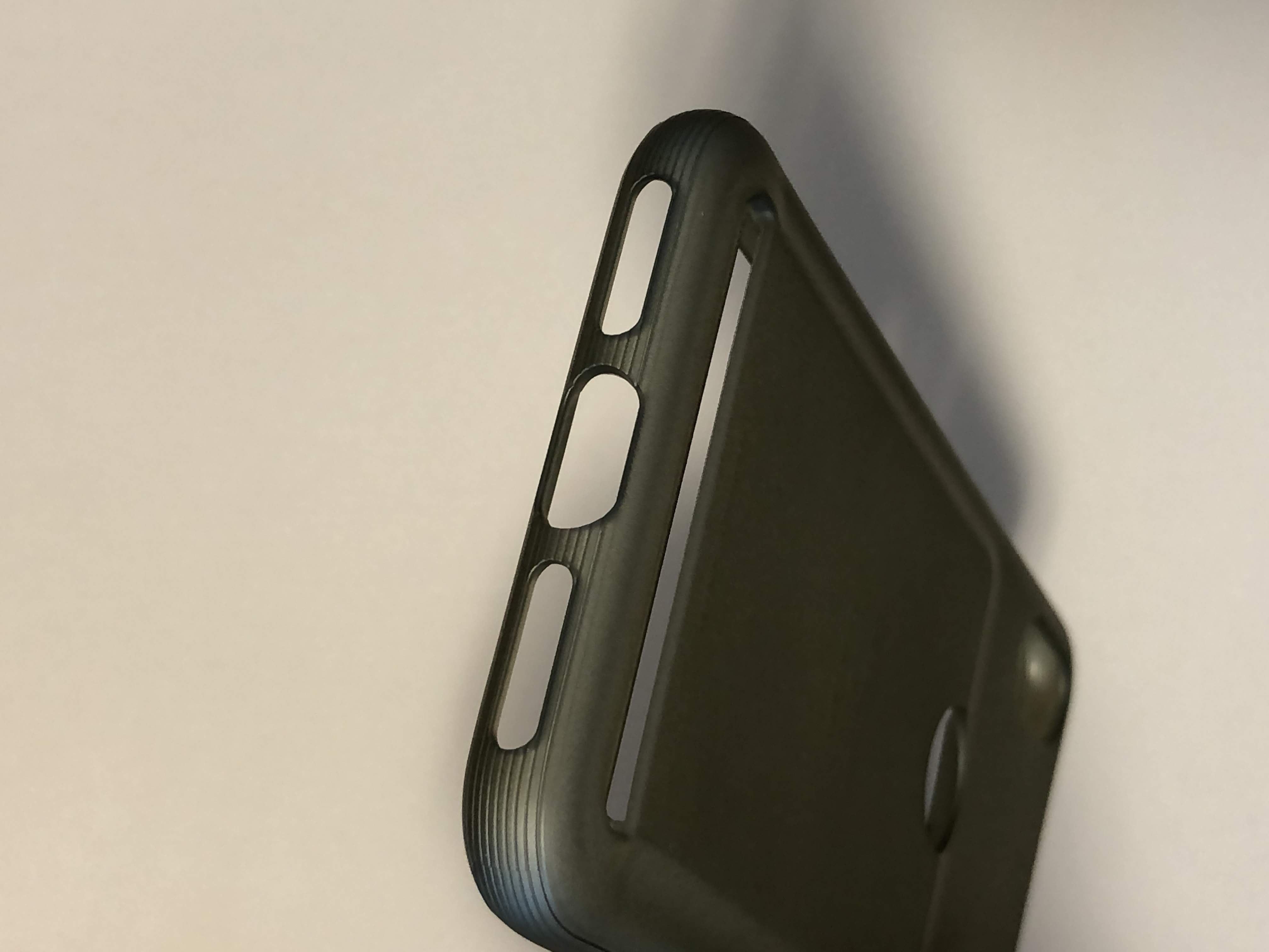 제품을 살펴보면 테두리 부분에 얇은 줄무늬로 장식되어 있어서 자칫 밋밋할 수 있는 디자인에 생기를 불어넣는 역할을 하고 있습니다. 좌측면과 우측면에 있는 키는 모두 덮히는 형태로 되어 있으며 하단부에는 스피커, 라이트닝포트, 마이크 부분에 딱 맞게 구멍이 뚫려 있습니다. 사진 상으로 봐도 부드러운 느낌이 드는 이 제품은 TPU(Thermoplastic Poly Urethane) 소재를 사용하여 탈부착이 편리하며 촉감이 좋습니다.