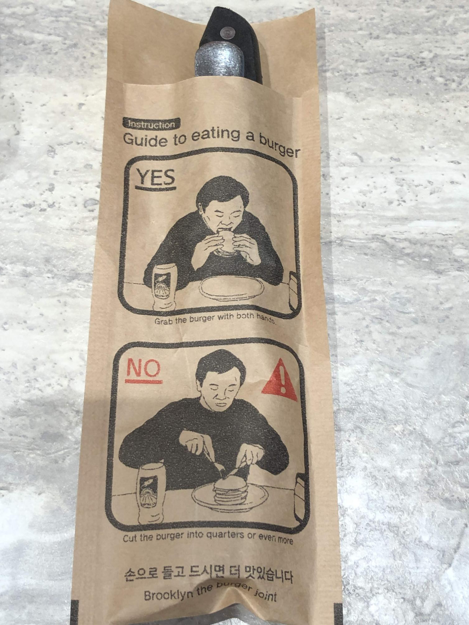 자리를 잡고 앉으면 직원분이 주문을 받아주는 방식이기 때문에 일반 식당과 마찬가지로 먼저 자리 안내부터 받게 됩니다. 주문을 마치고 테이블을 둘러보니 포크/나이프가 들어있는 봉투에 재밌는 그림이 있어서 담아보았습니다. 햄버거를 먹을 때 손으로 들고 드시면 더 맛있다는 내용인데 사실 수제버거를 전문으로 하는 가게 대부분이 크기가 큰 햄버거를 판매하기 때문에 손으로 들고 먹는 것보다 포크와 나이프를 이용하는 게 더 편한 것이 사실입니다. (브루클린 더 버거 조인트의 경우 손으로 들고 먹을 정도의 크기이긴 합니다.)