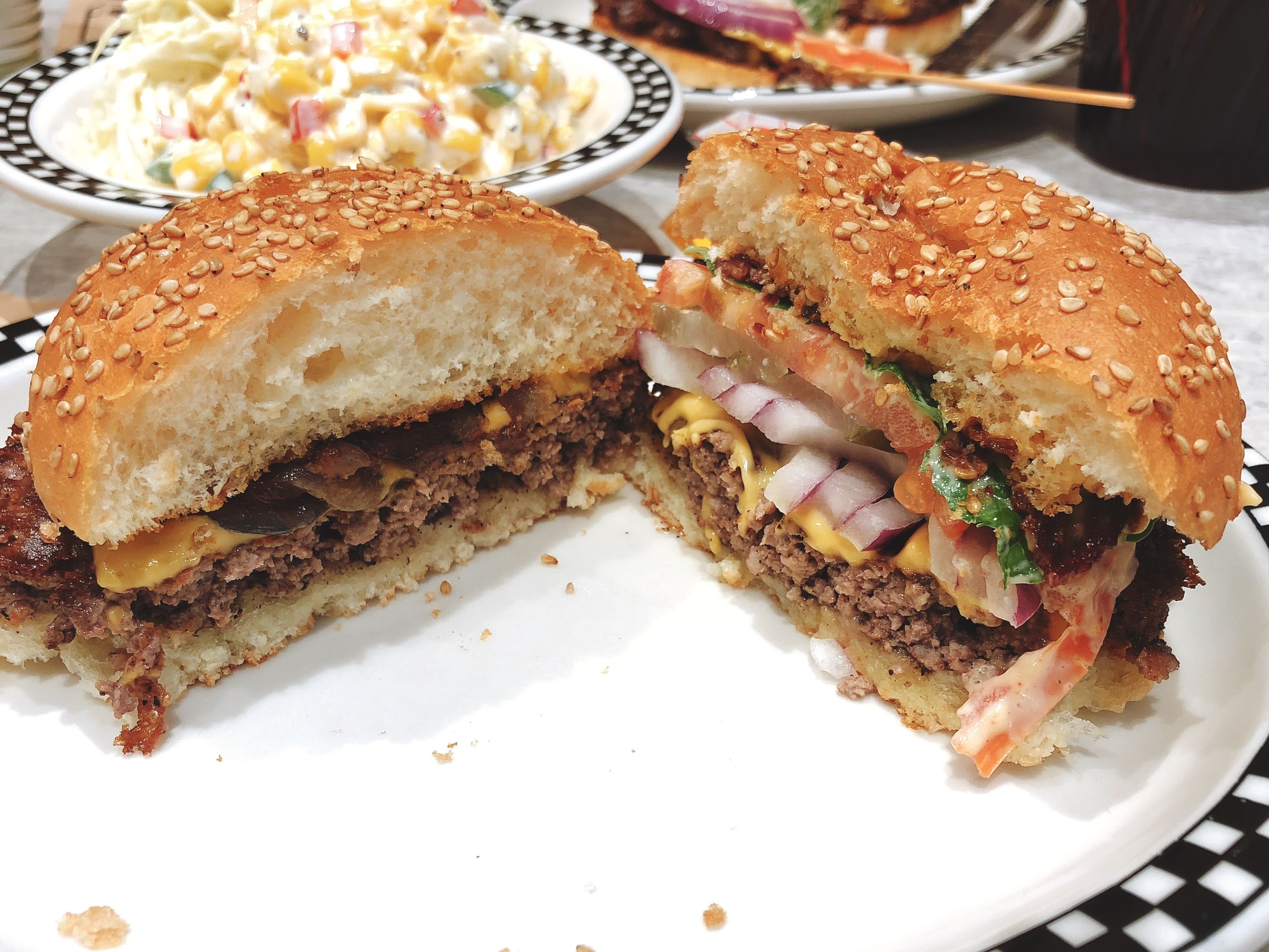 조금 더 자세히 보여드리기 위해 각각 반으로 잘라보았습니다. 왼쪽이 더 치즈버거 140g, 오른쪽이 브루클린 웍스 140g입니다. 더 치즈버거는 가장 기본적인 재료만 들어가서 다른 맛이 많이 섞이지 않기 때문에 패티 본연의 맛을 느끼고 싶은 분들에게 추천합니다. 브루클린 웍스는 양파, 토마토 등 햄버거의 맛을 살려주는 다양한 재료들이 들어가서 풍성한 맛을 선사합니다. 수제버거집에서 먹는 버거다운 맛을 느끼고 싶은 분들에게 어울리는 메뉴입니다.