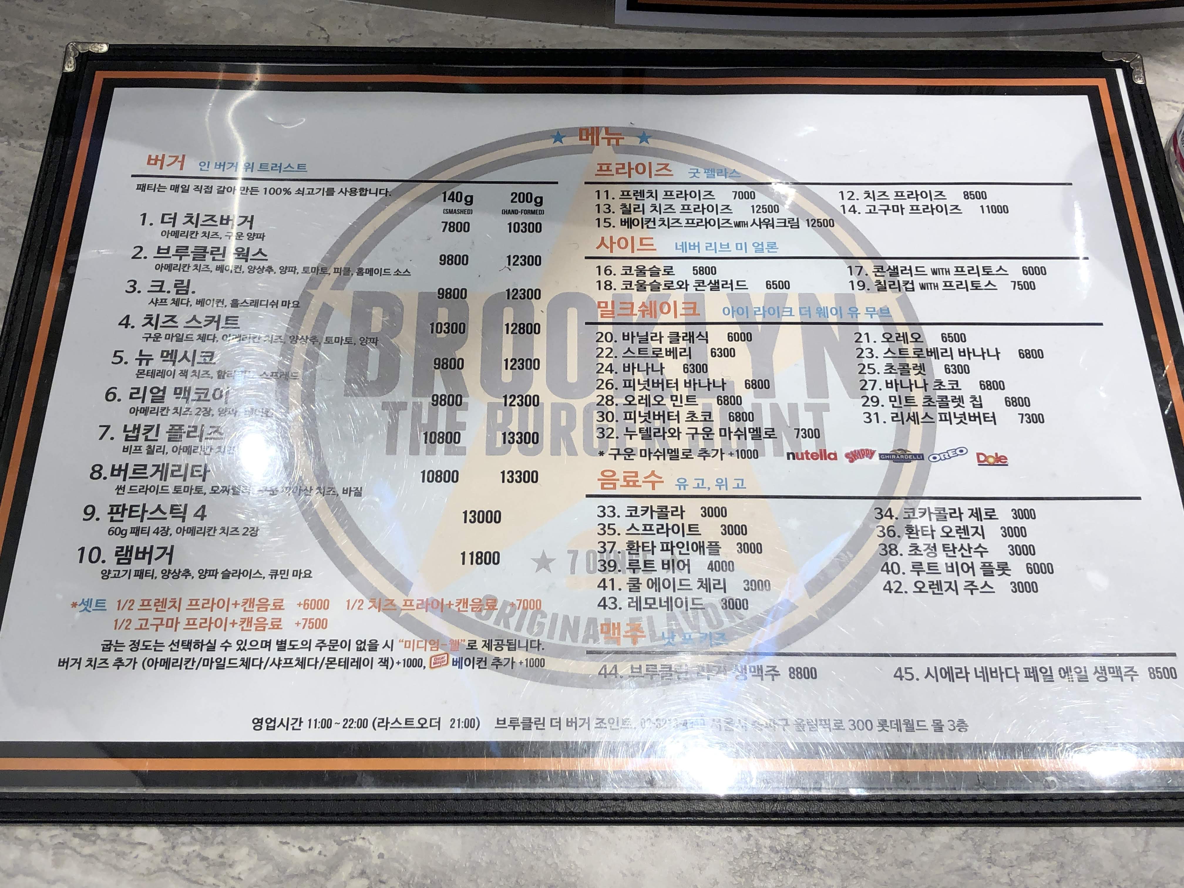 브루클린 더 버거 조인트의 메뉴판입니다. 메뉴는 크게 버거, 프라이즈, 사이드, 밀크쉐이크, 음료수, 맥주로 나뉘어 있습니다. 가장 중심이 되는 건 역시 버거 메뉴인데 그 종류만 해도 10가지나 됩니다. 각각의 특징이 분명한 메뉴들이라서 고르기가 어려웠습니다. 패티는 140g, 200g 중에서 선택이 가능하며 굽는 정도는 별도 주문이 없을 경우 "미디엄 웰"로 제공된다고 합니다. 미디엄 웰은 우리가 먹는 일반적인 햄버거 정도의 패티 굽기라고 보시면 됩니다. 또한 1/2 프렌치 프라이, 1/2 고구마 프라이, 1/2 치즈 프라이와 캔음료 세트로 주문하는 것도 가능합니다.