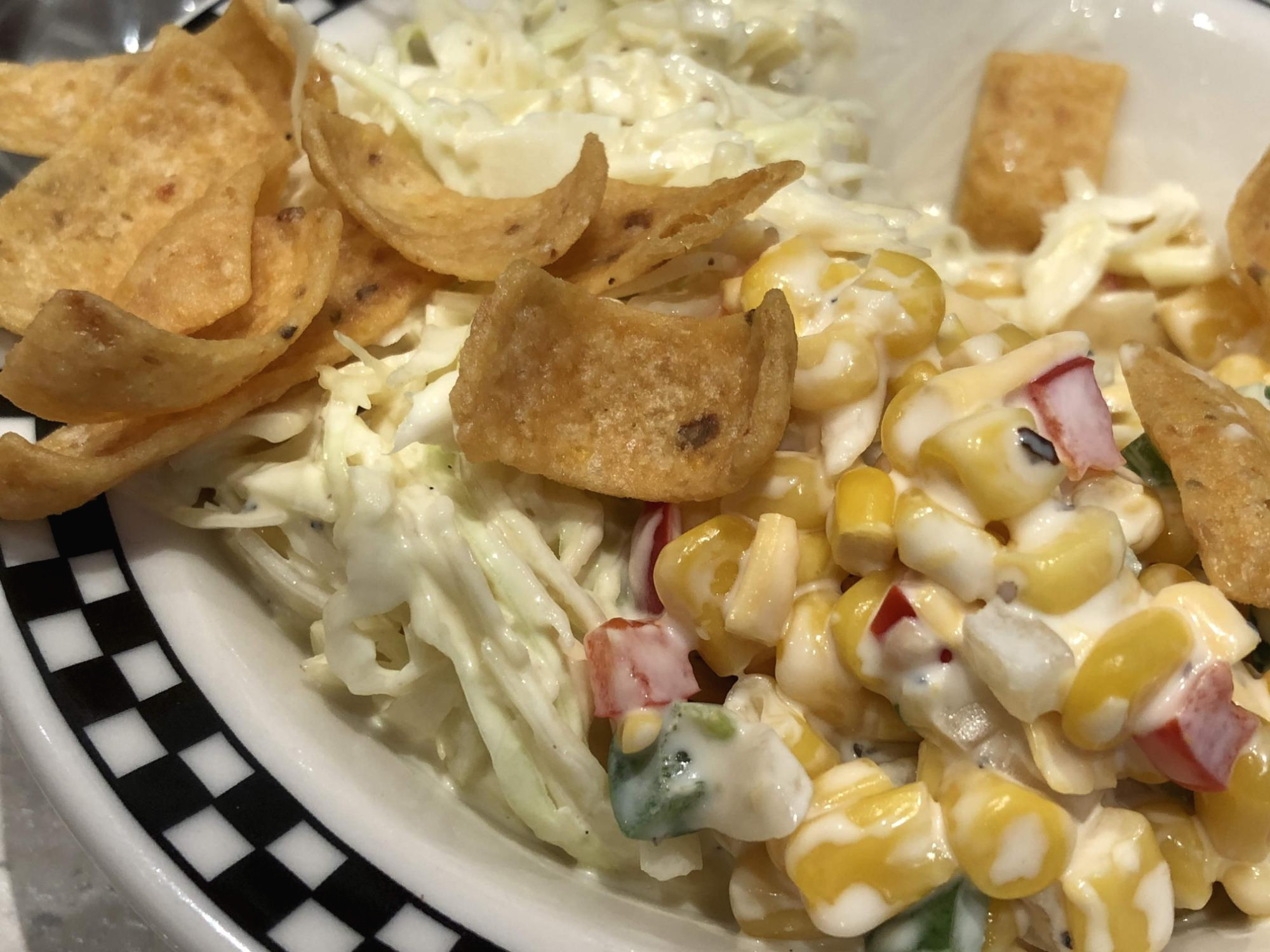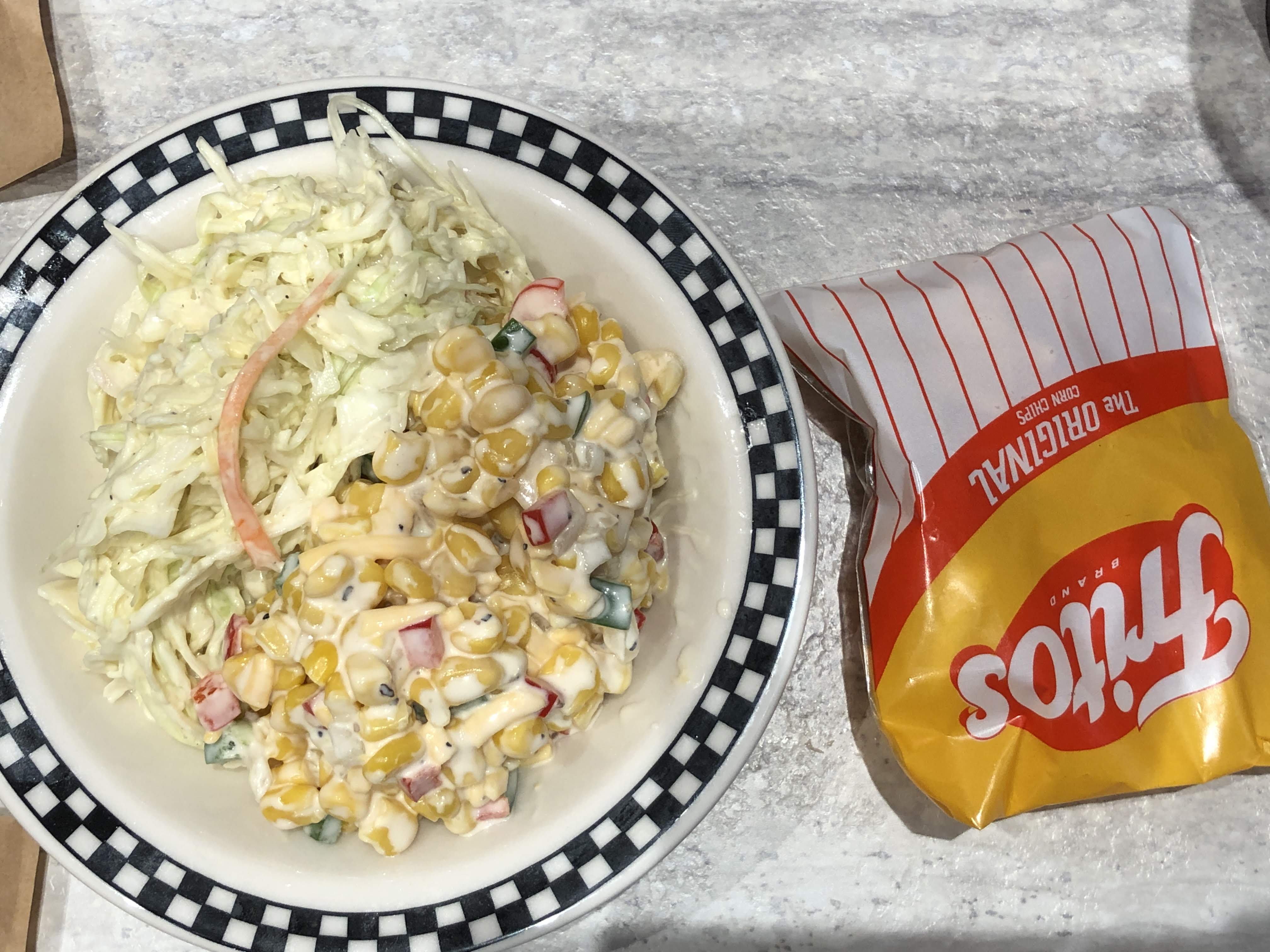 코울슬로와 콘샐러드는 프리토스라는 과자를 함께 제공합니다. 마치 토핑처럼 코울슬로와 콘샐러드 위에 뿌려먹는 건데, 바삭하고 고소한 맛이 잘 어울렸습니다.