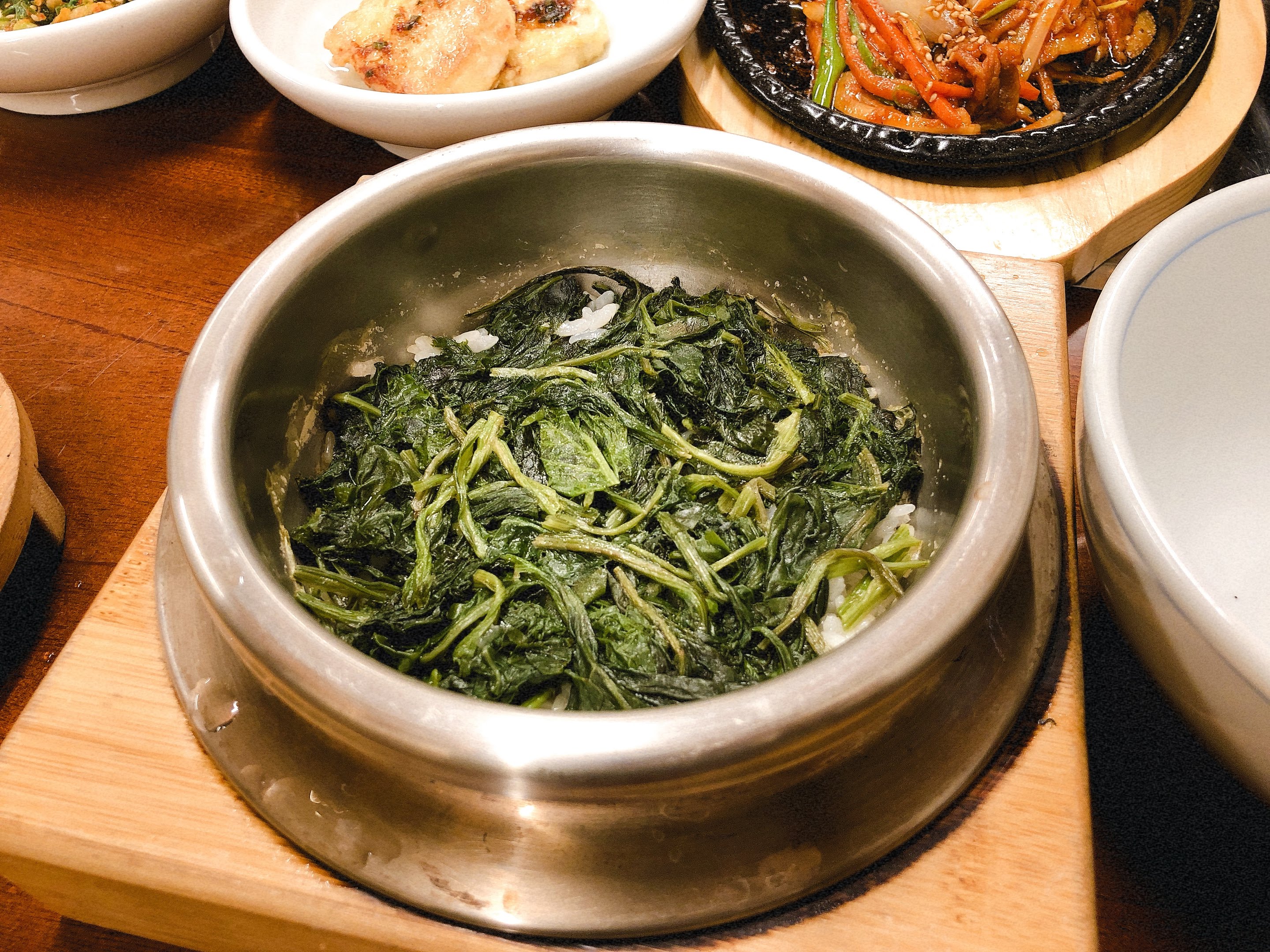 곤드레밥은 1인용 스테인리스 솥에 담아져 나옵니다. 밥을 가득 덮은 곤드레 양도 많은 편이고 밥의 찰기, 윤기도 풍부한 편입니다. 함께 제공되는 빈 공기에 옮겨 담고 약간 남은 누룽지에 뜨거운 물 말아 숭늉으로 드시면 됩니다.