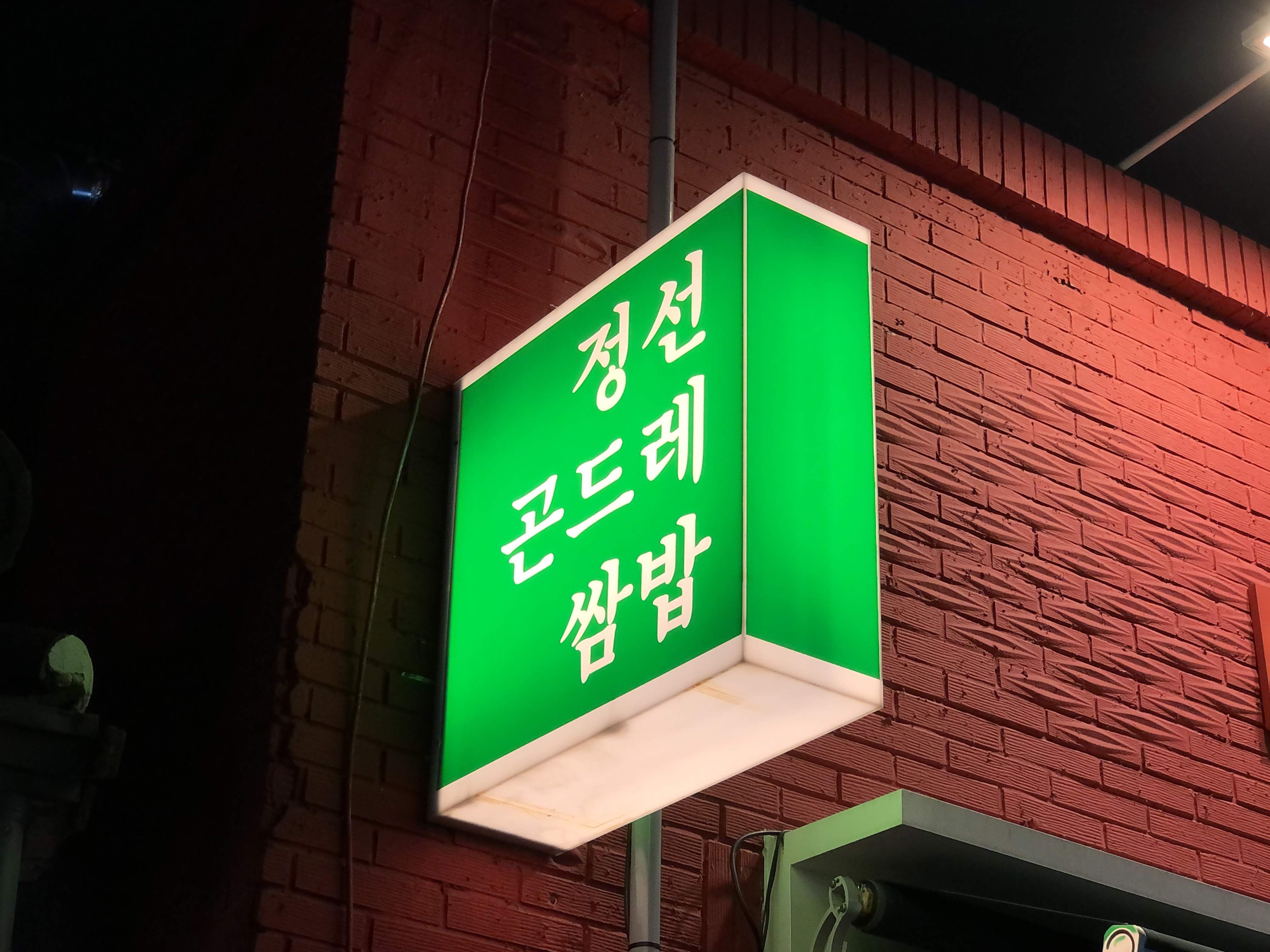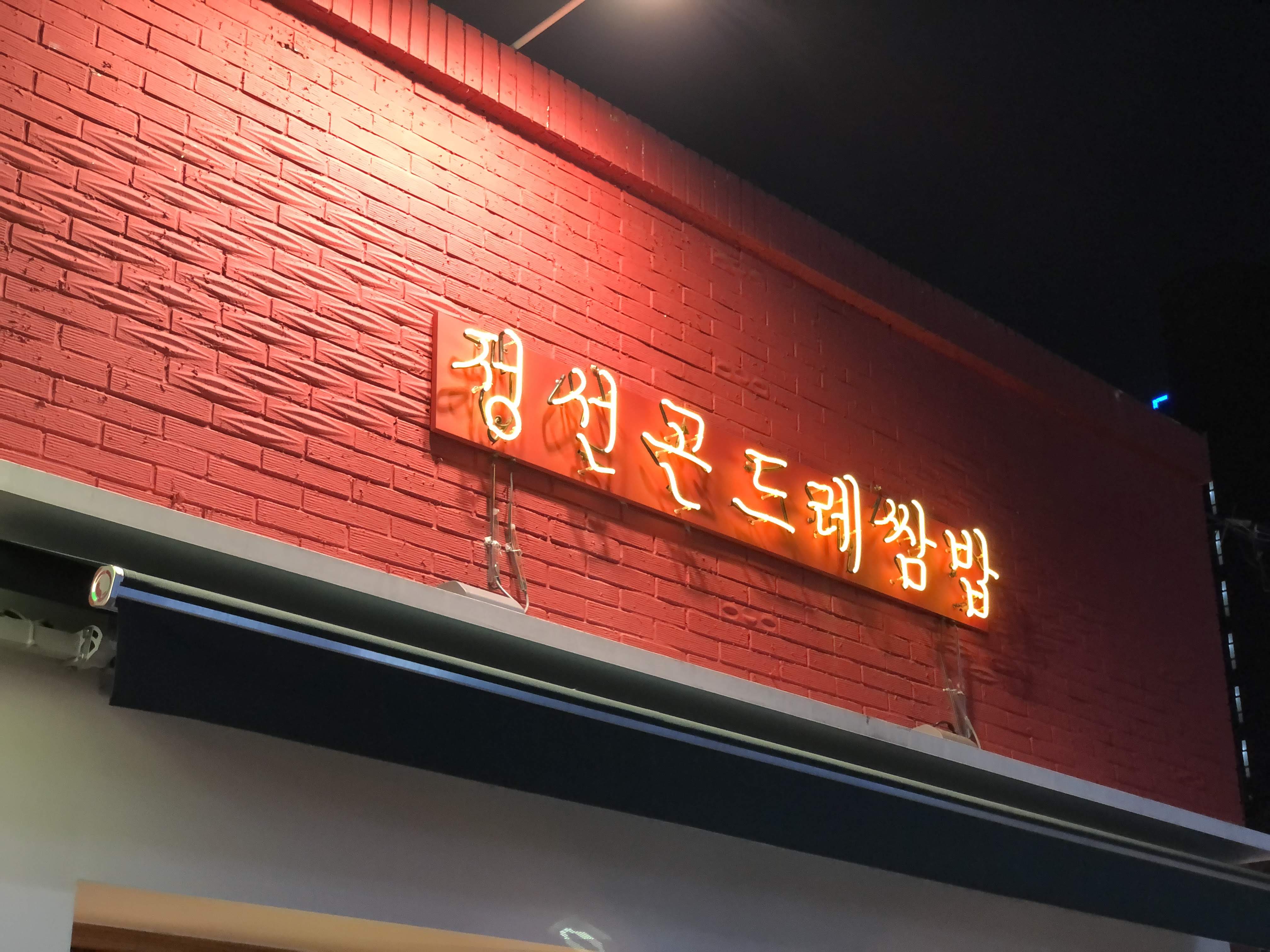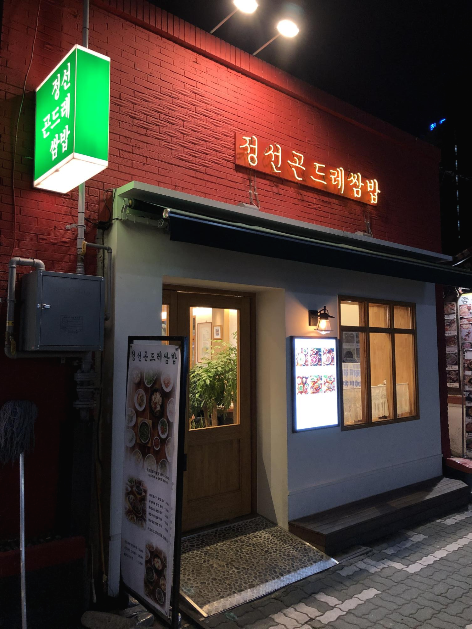 정선곤드레쌈밥 입구에서 본 모습입니다. 먼저 벽돌벽 전체를 채운 빨강색이 세련된 느낌을 전해줍니다. 측면에 걸린 녹색 간판과 정면에서 보이는 빨간 네온 간판은 빨간 벽과 잘 어우러집니다. 그 밑으로 하얀 벽면과 나무로 된 문이 어우려저 편안하고 아늑한 분위기를 연출합니다. 근처 가게들 중 가장 깔끔하고 선명한 이미지를 전달하는 곳입니다. 내부 사진은 촬영하지 못했지만 깔끔하게 정돈되어 있습니다.