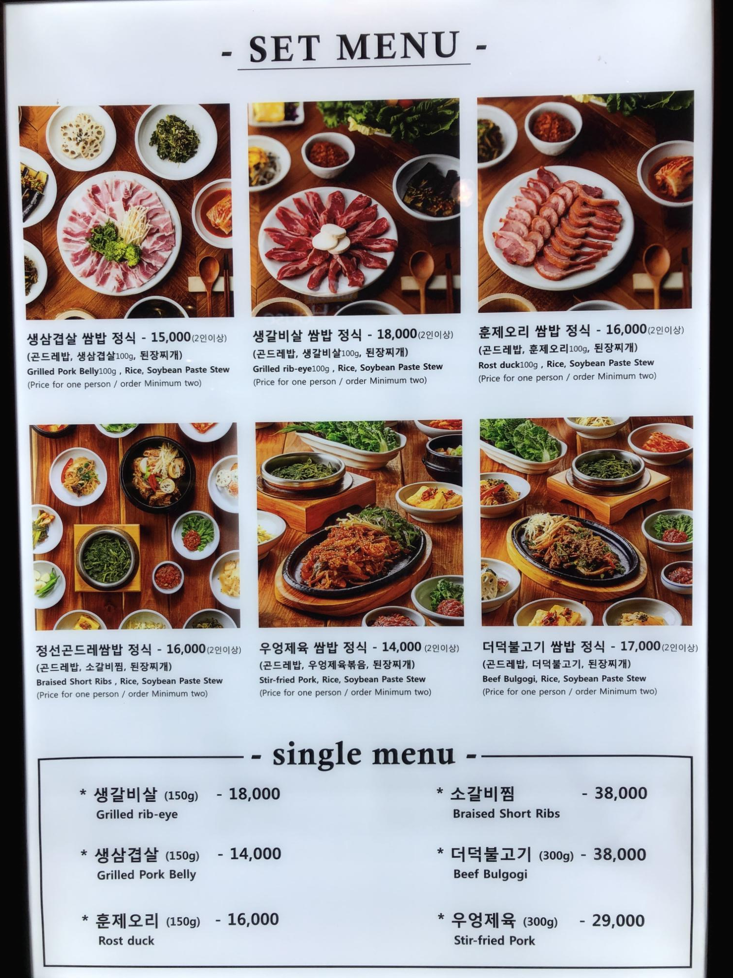 정선곤드레쌈밥의 메뉴입니다. 크게 세트 메뉴와 싱글 메뉴로 나눌 수 있습니다. 세트 메뉴는 모두 2인 이상 주문을 원칙으로 합니다. 각종 밑반찬과 곤드레밥을 기본으로 하여 생삼겹살 쌈밥 정식(15,000원), 생갈비살 쌈밥 정식(18,000원), 훈제오리 쌈밥 정식(16,000원), 정선곤드레쌈밥 정식(16,000원), 우엉제육 쌈밥 정식(14,000원), 더덕불고기 쌈밥 정식(17,000원)의 6가지 중에서 선택할 수 있습니다. 싱글 메뉴는 각각의 세트 메뉴에 나오는 메인 요리를 단품으로 구성한 것입니다.