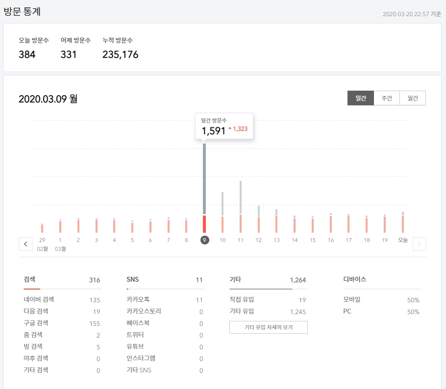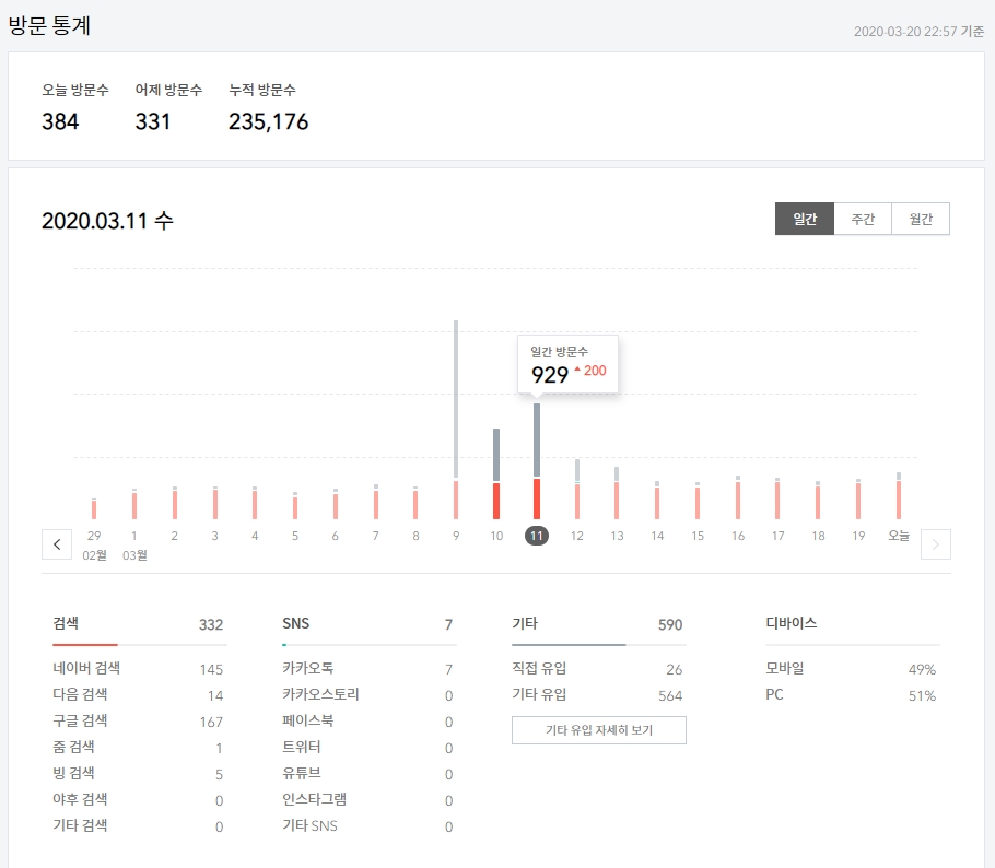 2020년 3월 9일부터 3월 11일까지의 방문자수는 각각 1,591명(3월 9일)/ 729명(3월 10일)/ 929명(3월 11일)입니다. 총 3,249명으로 월평균 블로그 총 방문자수에 근접한 숫자입니다. 이처럼 평소보다 매우 많은 분들이 찾아와 주신만큼 수익에도 변화가 있었습니다.
