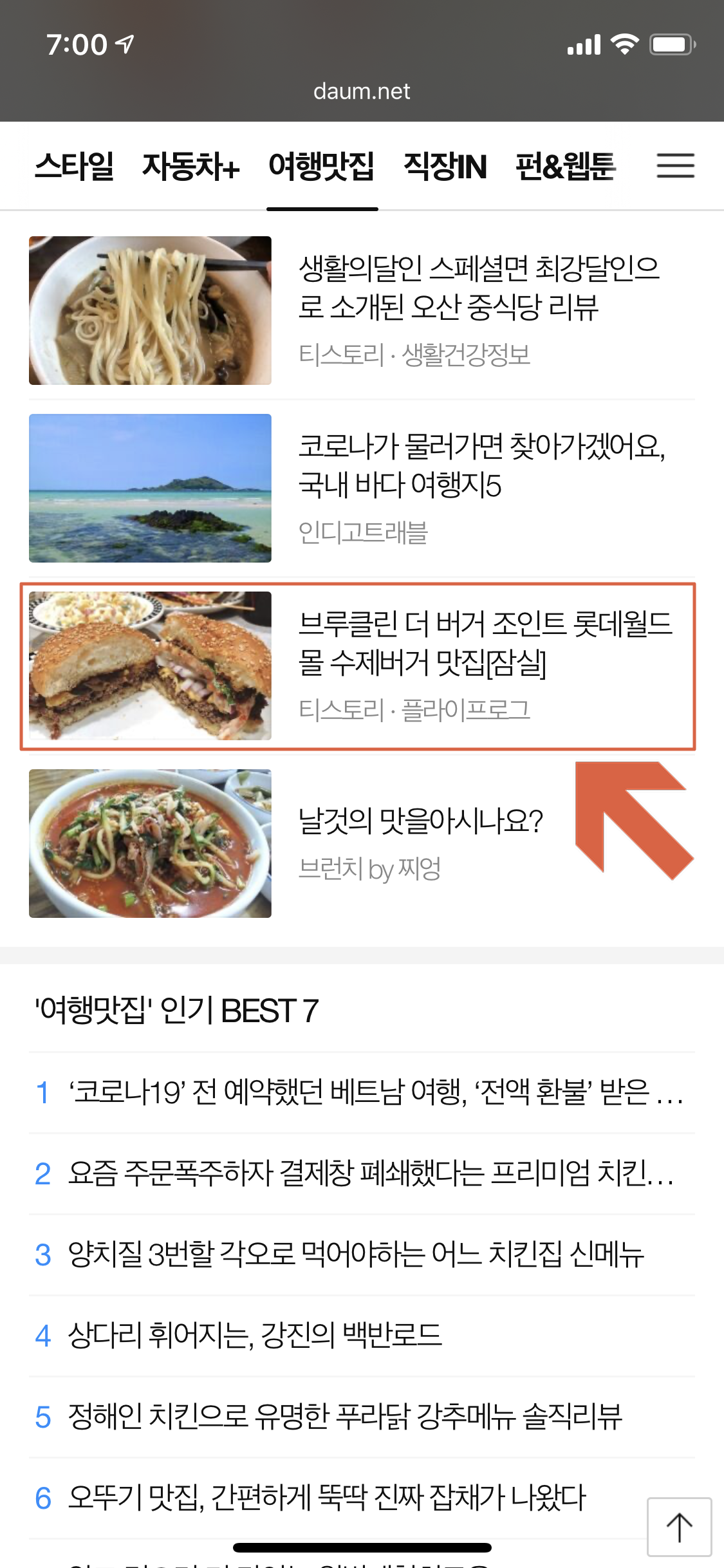 방문자수와 외부 유입의 증가세를 확인한 저는 캡처를 하기 위해 다음 홈페이지에 방문했습니다. [잠실] 브루클린 더 버거 조인트 롯데월드몰 수제버거 맛집이 메인에 올라간 첫날 그리고 [인사동] 쌈지길 근처 한정식 맛집 정선곤드레쌈밥이 메인에 올라간 둘째 날 모두 다음 메인을 샅샅이 뒤졌지만 첫날에만 겨우 캡처에 성공했습니다. 게다가 PC버전에서는 아예 찾아보는 것조차 실패했습니다. 아무래도 다른 분들의 PC 또는 모바일 기기에서는 잘 보이는 것 같은데 이상하게 제가 제 글을 보기 위해선 수차례 새로고침을 해야만 했습니다.