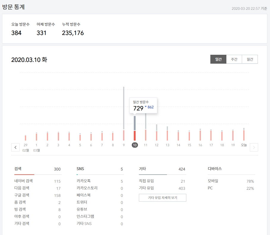 지난 두 번의 메인 등재 경험을 토대로 이제 갑작스러운 방문자 수와 외부 유입의 증가는 어딘가에서 제 글이 주목을 받고 있다는 것을 알게 되었습니다. 그리고 그중 대다수는 다음 홈페이지에 제 글이 올라가는 경우라는 것도 알게 되었죠. 물론 여전히 제 글이 다음 메인 어딘가에 뜬다는 사실 자체는 매우 기쁘고 즐겁고 감사한 경험입니다. 그런데 이번에는 감사한 일이 하나 더 있었습니다. 바로 제 글이 두 번 연속으로 다음에 올라가게 된 것입니다. 하나의 글만 주목받아도 좋은데 두 개 연속으로 이런 행운이 따라오다니 정말 기뻤습니다. 참고로 아래 방문 통계를 보시면 처음 글이 메인에 올라간 날(3월 9일)과 그다음 날이자 두 번째 글일 메인에 올라간 날(3월 10일) 그리고 두 번째 글이 메인에 남아있던 날(3월 11일)까지 방문자 수가 평균에 비해 매우 높은 수치를 기록한 것을 확인할 수 있습니다.