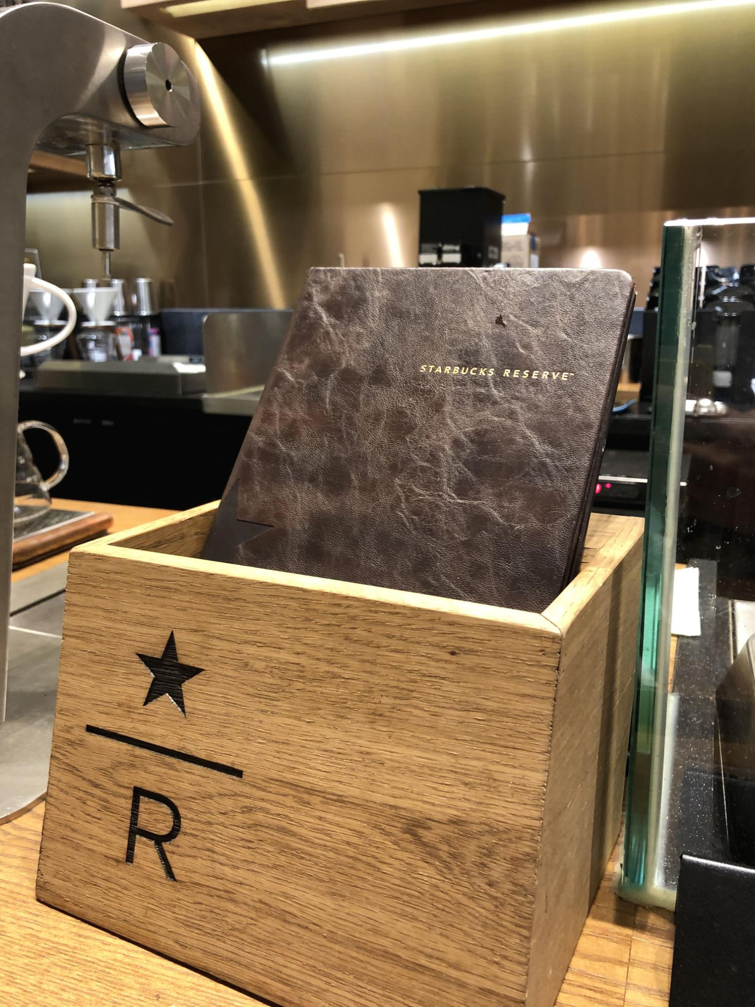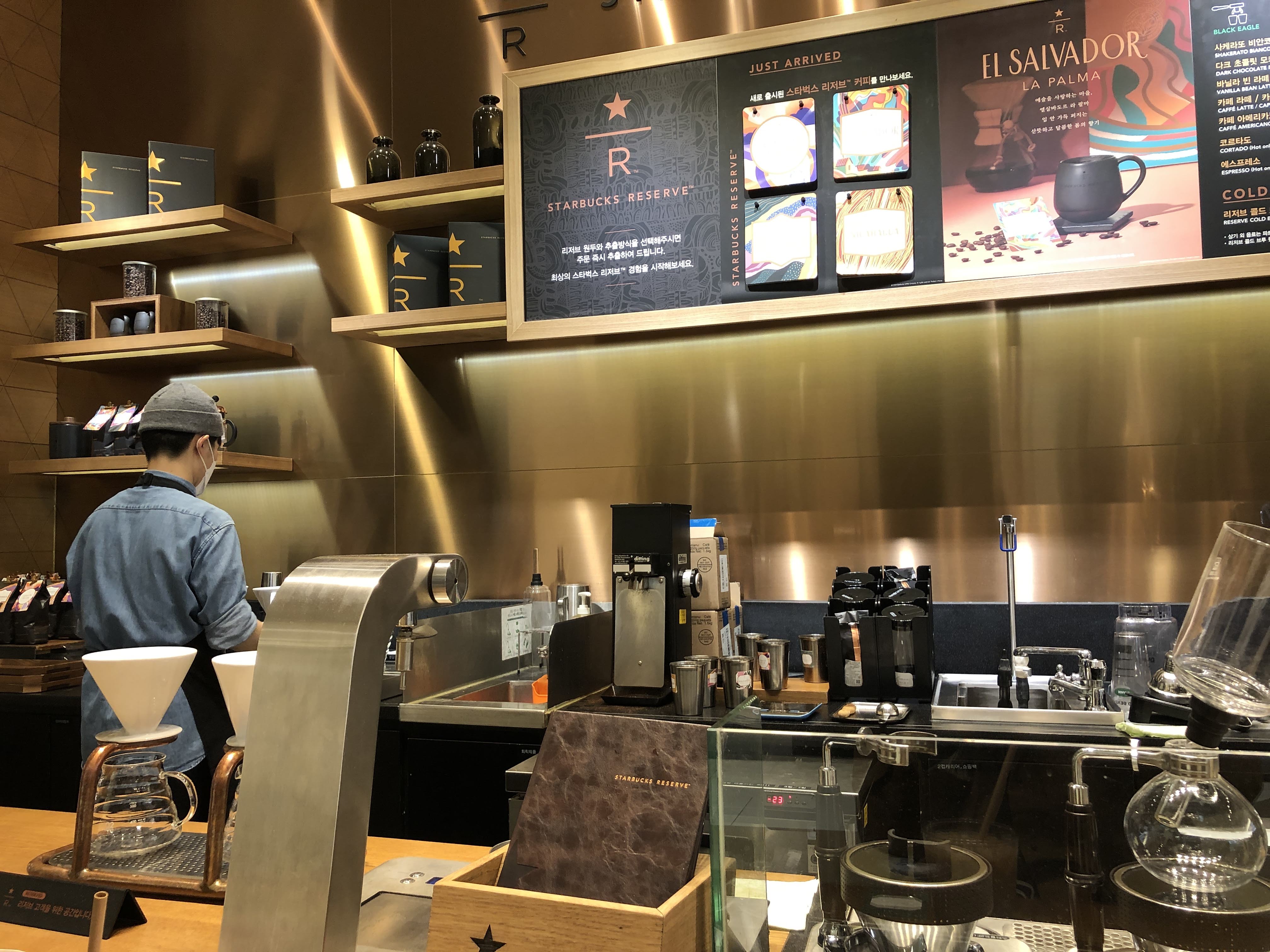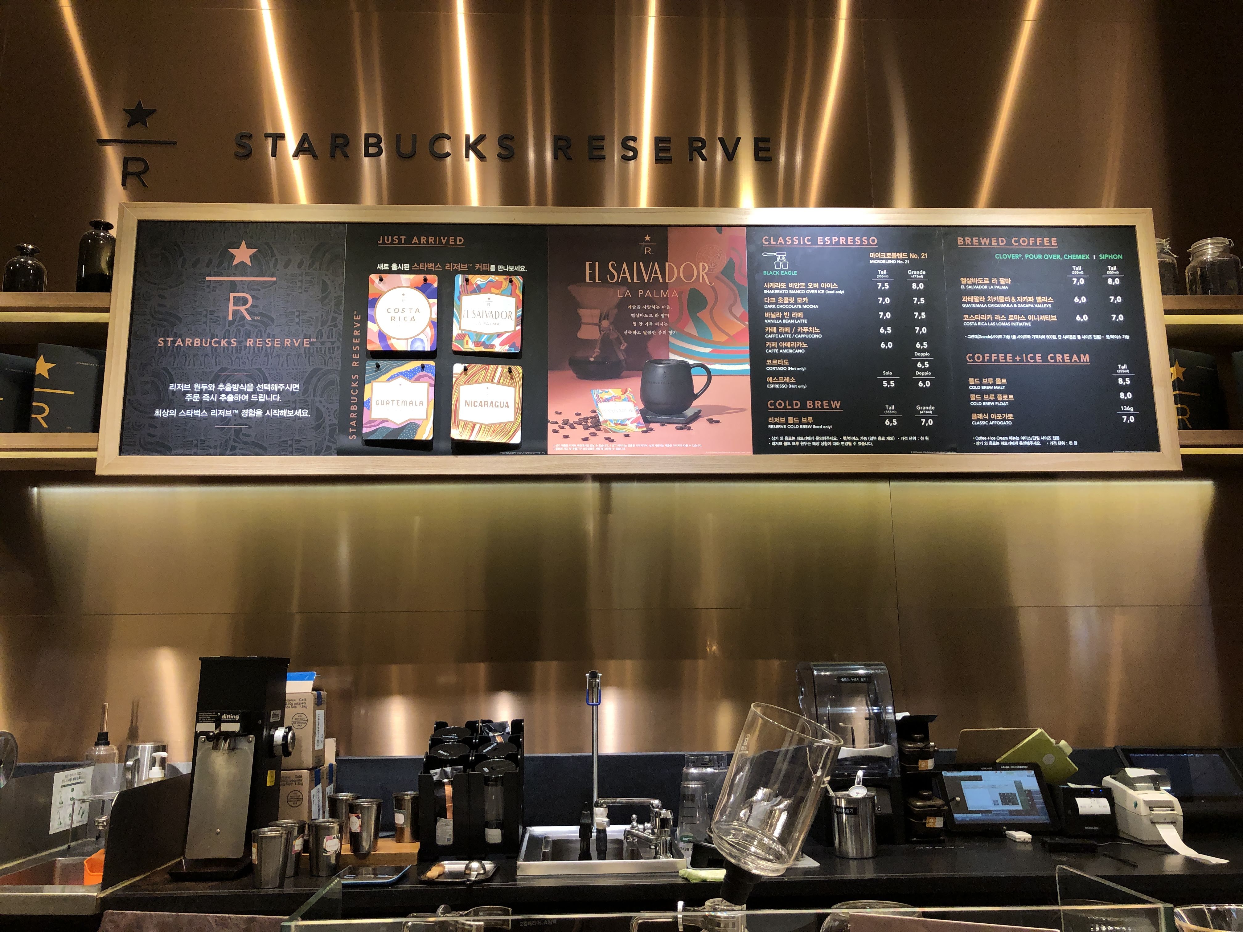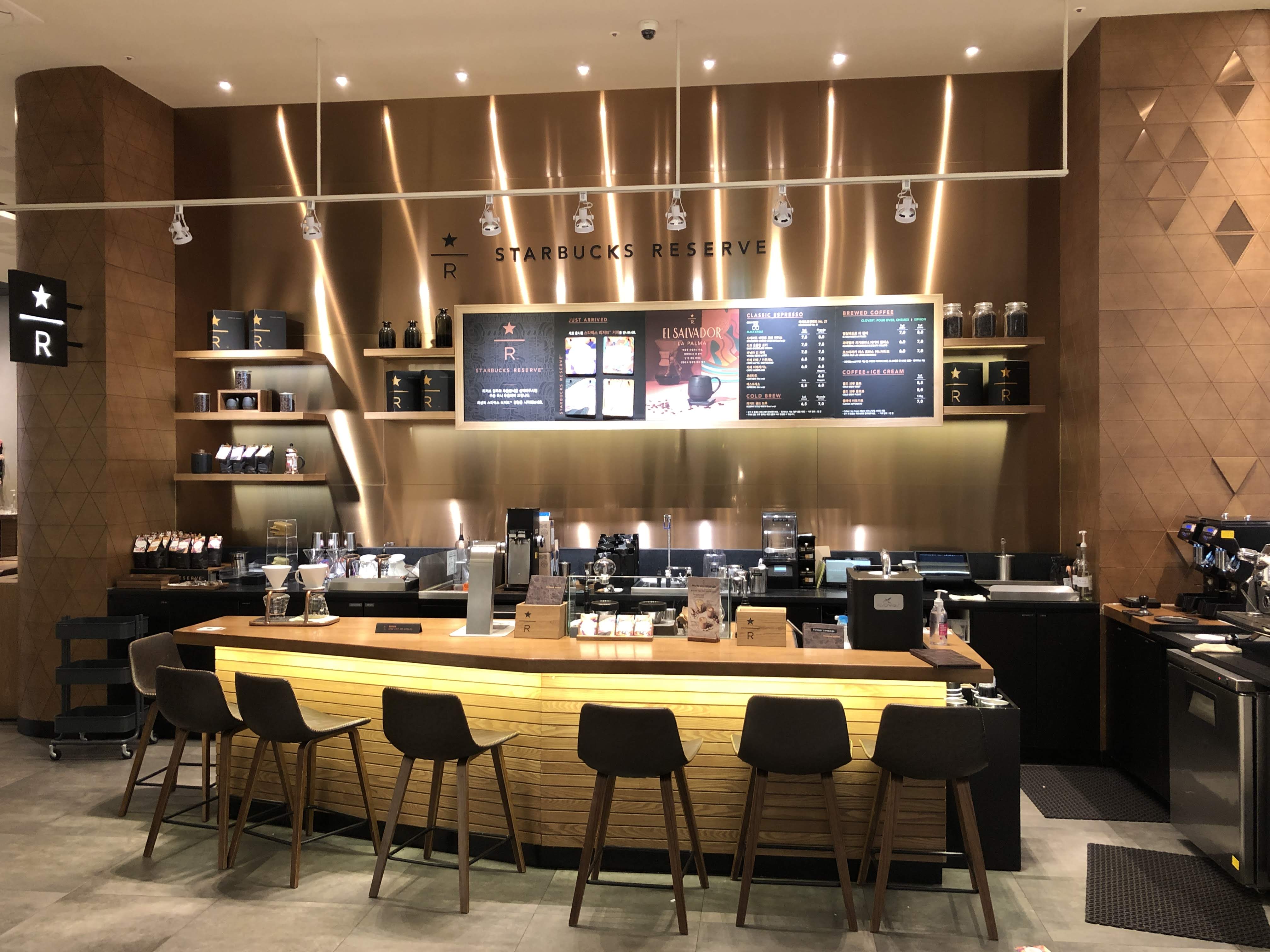 황동 빛으로 멋스럽게 꾸며진 이 곳이 리저브 매장입니다. 리저브 매장 메뉴판, 커피 제조 코너, 리저브 고객을 위한 좌석도 따로 마련되어 있습니다. 평일 저녁 사람이 별로 없는 시간에 방문하다 보니 마치 매장 안내 사진처럼 아무도 없는 매장을 촬영할 수 있었습니다.