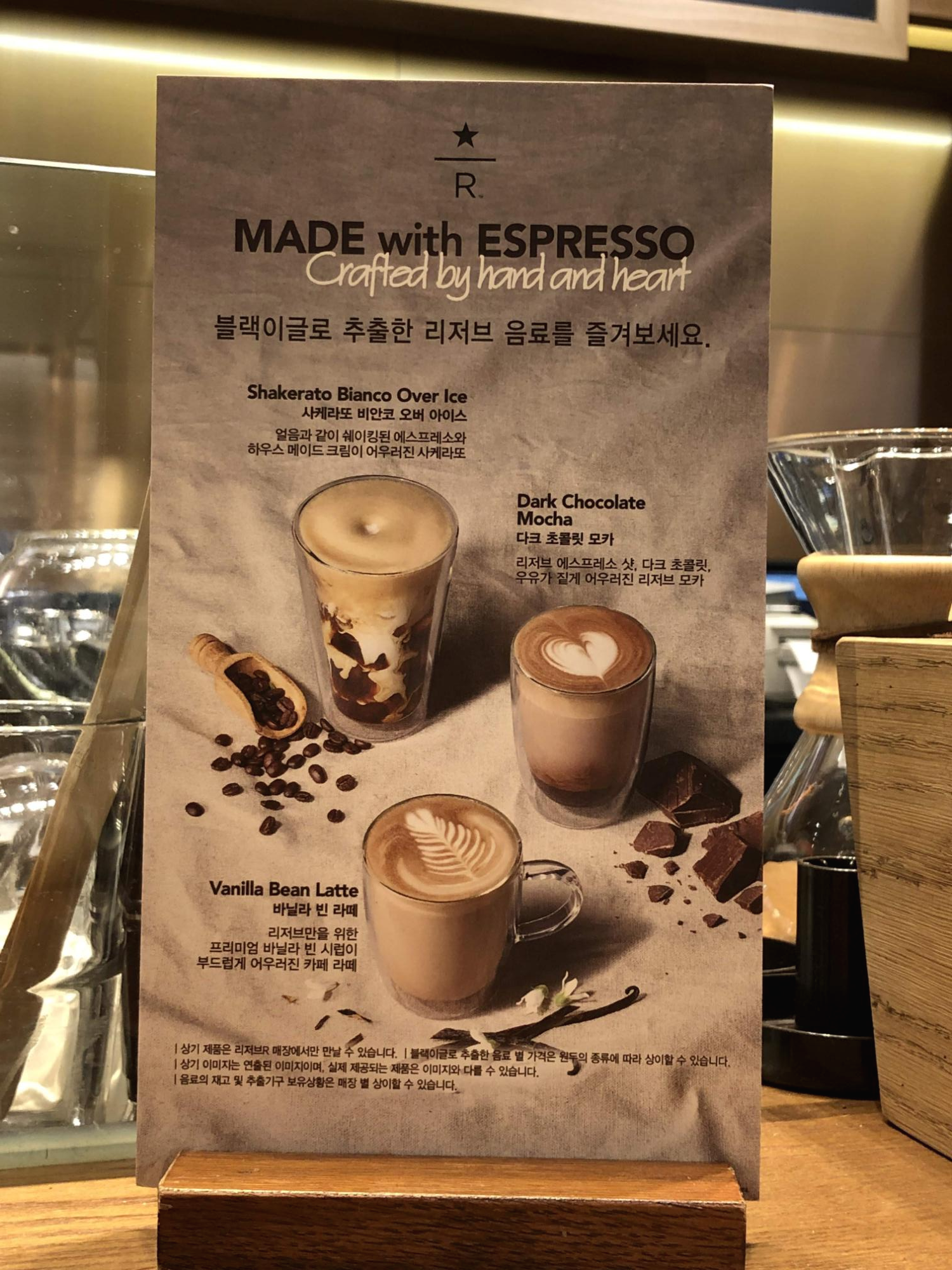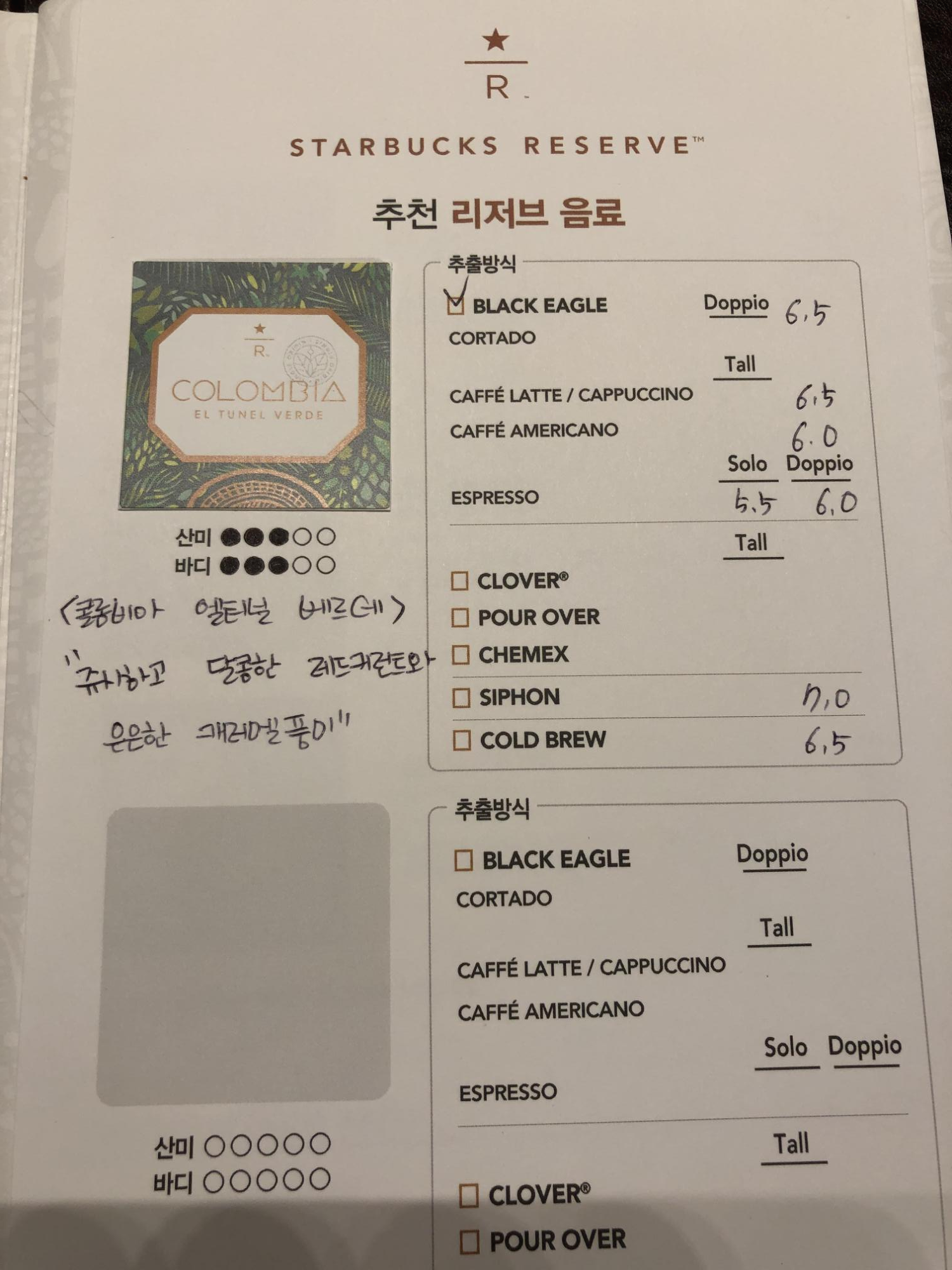 스타벅스 리저브만의 메뉴가 가득한 메뉴판은 별도의 나무 보관함에 담겨 있습니다. 일반 매장에는 계산대 뒤편에 있는 큰 메뉴판만 제공하는 것에 비하면 이런 사소한 면에서도 특별함을 담고자 노력한 것을 알 수 있습니다. 테이블 한 켠에는 이 날 저희 일행이 마신 블랙이글 방식으로 추출한 바닐라 빈 라떼에 대한 설명도 있었습니다. 다양한 원두를 다양한 방식으로 추출하여 그 샷으로 다양한 음료를 만들어 주기 때문에 리저브 매장에서 즐길 수 있는 메뉴는 정말 무궁무진하다고 보시면 됩니다.
