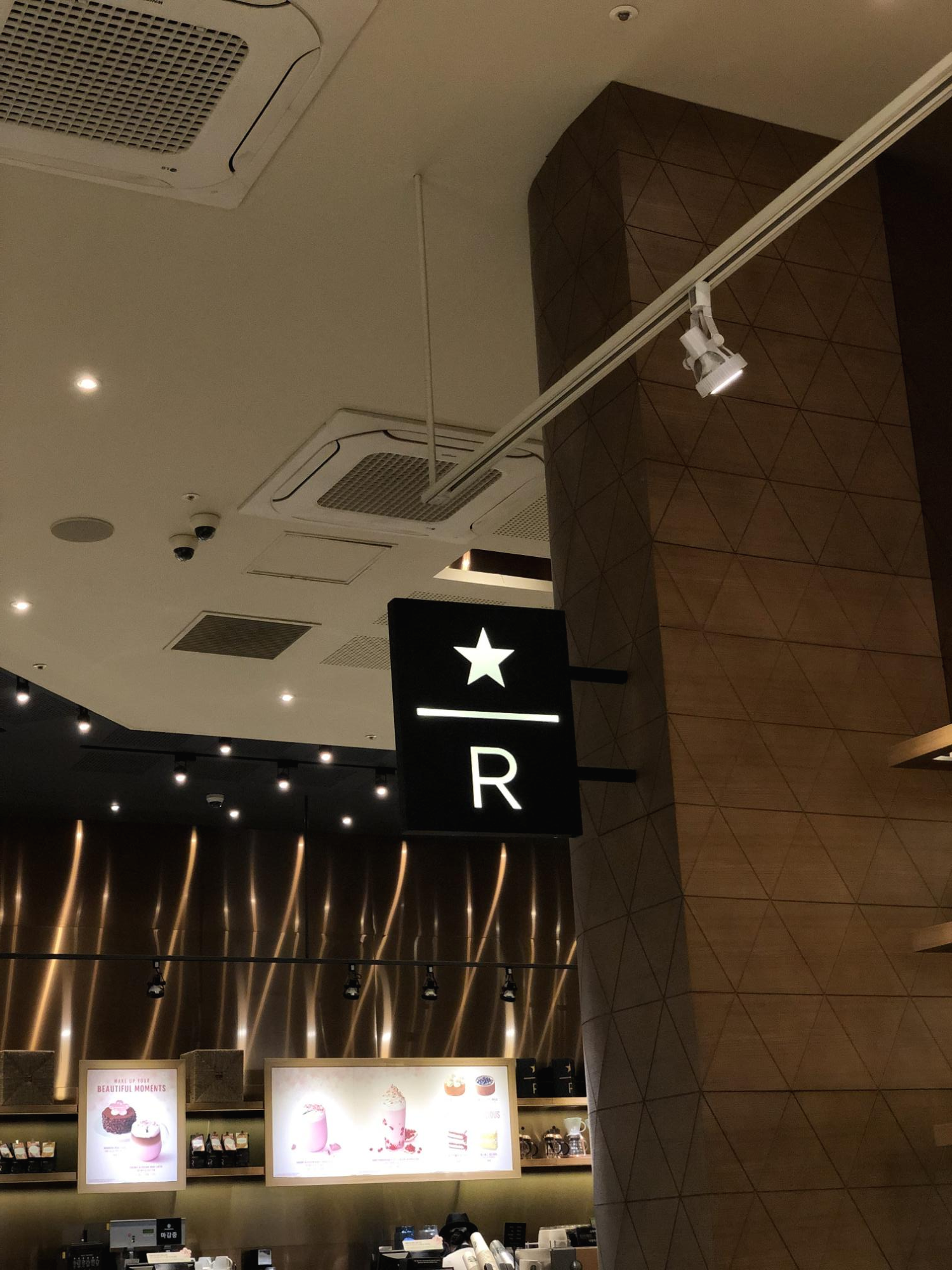 벽에는 스타벅스 리저브 매장임을 나타내는 간판이 붙어있습니다. 별 모양과 영문자 R을 이용하여 간결하게 만든 로고가 인상적입니다.