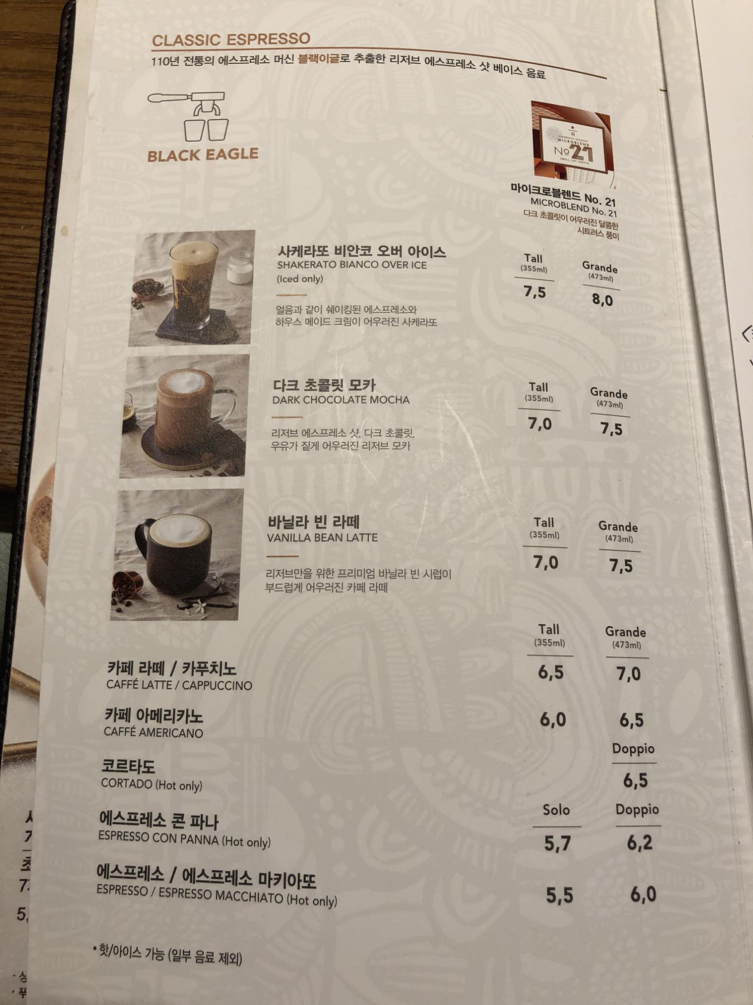 메뉴판에는 추출방식과 그에 따른 다양한 음료가 가지런히 정리되어 있습니다. 이 날 저희가 마신 메뉴는 블랙이글로 추출한 샷을 이용하여 만든 바닐라 빈 라떼(VANILLA BEAN LATTE)입니다. 가격은 톨 사이즈 7,000원 / 그란데 사이즈 7,500원입니다. 선택한 원두는 다크초콜릿이 어우러진 달콤한 시트러스 풍미의 마이크로블렌드 No.21과 쥬시하고 달콤한 레드커런트와 은은한 캐러멜 풍미의 콜롬비아 엘터널 브렌데입니다.