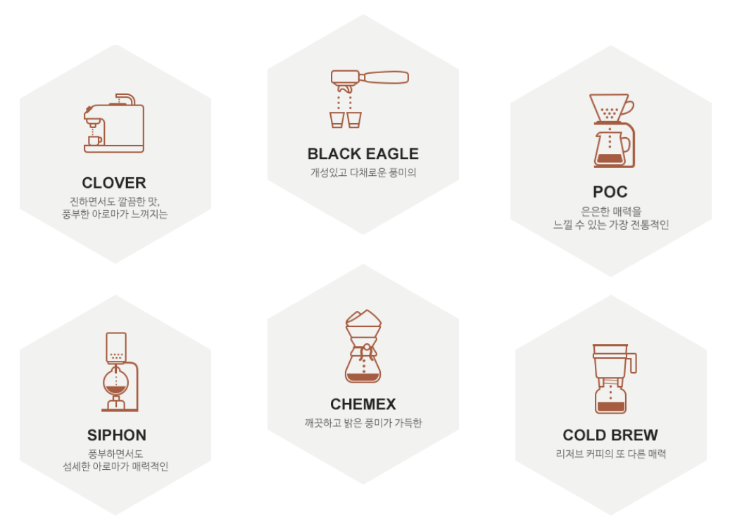 또한 스타벅스 리저브 전용매장에서는 6가지의 리저브 추출방식 (클로버®, 블랙 이글, POC, 사이폰, 케멕스, 리저브 콜드 브루) 중에서 직접 선택하여 음료 추출이 가능합니다. 같은 원두도 어떤 방식으로 추출하느냐에 따라 그 맛과 향이 달라지고 또한 새로운 추출방식이 주는 보는 즐거움도 있기 때문에 커피를 더욱 맛있게 즐길 수 있다는 장점이 있다고 할 수 있습니다.