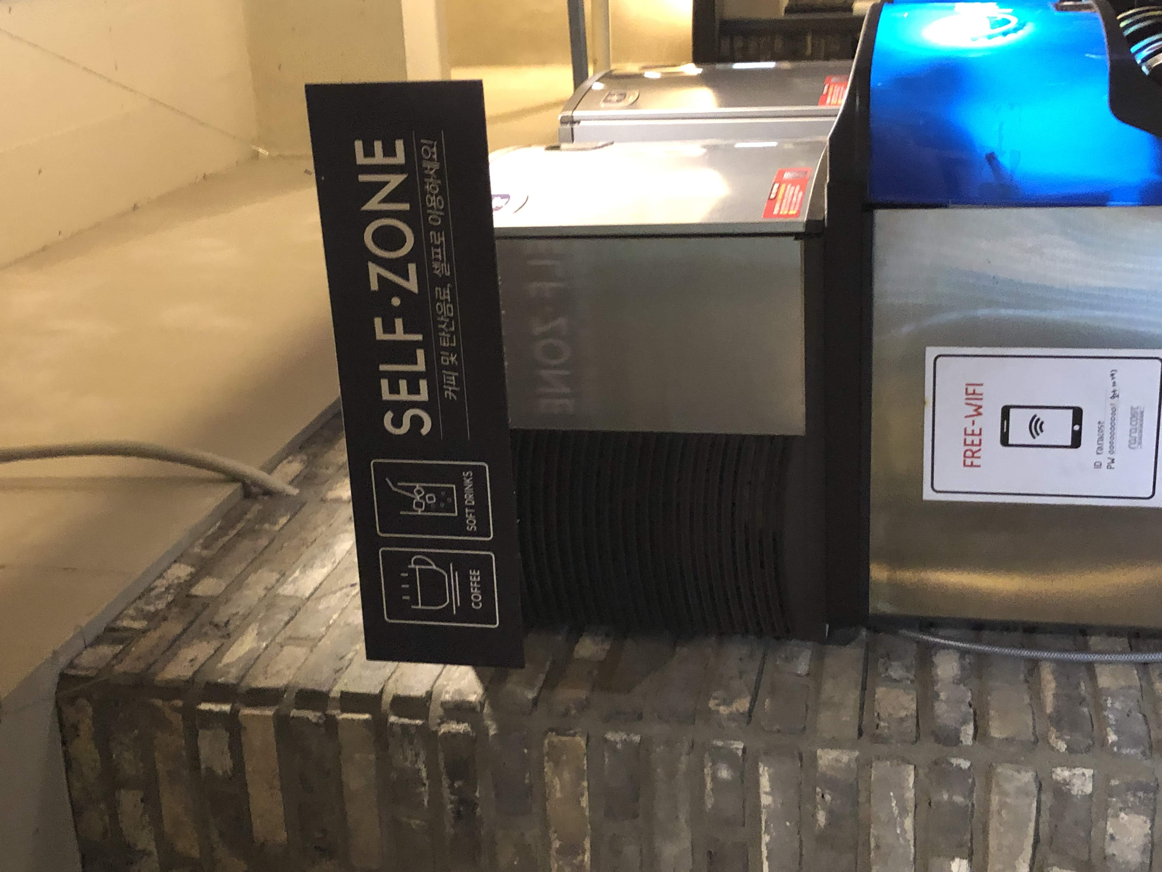 셀프존에는 앞접시 등의 식기와 무료 제공되는 음료가 마련되어 있습니다. 그리고 사진에는 담지 못했지만 반대편에는 피클도 마음껏 가져갈 수 있게 준비되어 있습니다.