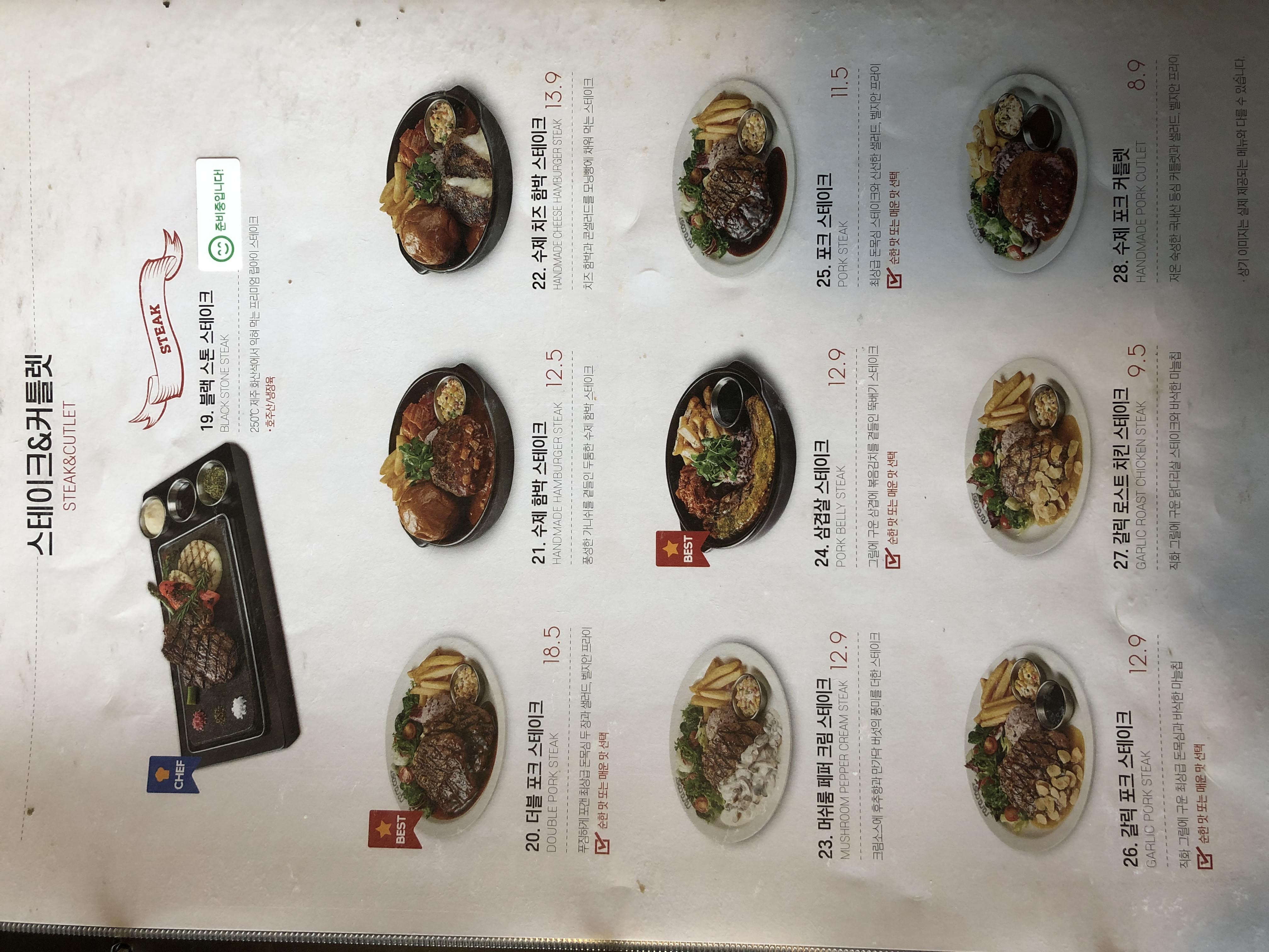 스테이크&커틀렛 메뉴입니다. 가장 인상적인 메뉴는 베스트 메뉴이기도 한 삼겹살 스테이크(1만 2천 9백원)입니다. 그릴에 구운 삼겹살과 볶음김치를 곁들여주는 메뉴 구성이 마치 삼겹살을 구워 먹는 것과 비슷한 느낌인데 다음에 방문하면 꼭 시켜먹어볼 예정입니다. 이외에도 다양한 메뉴가 준비되어 있습니다.