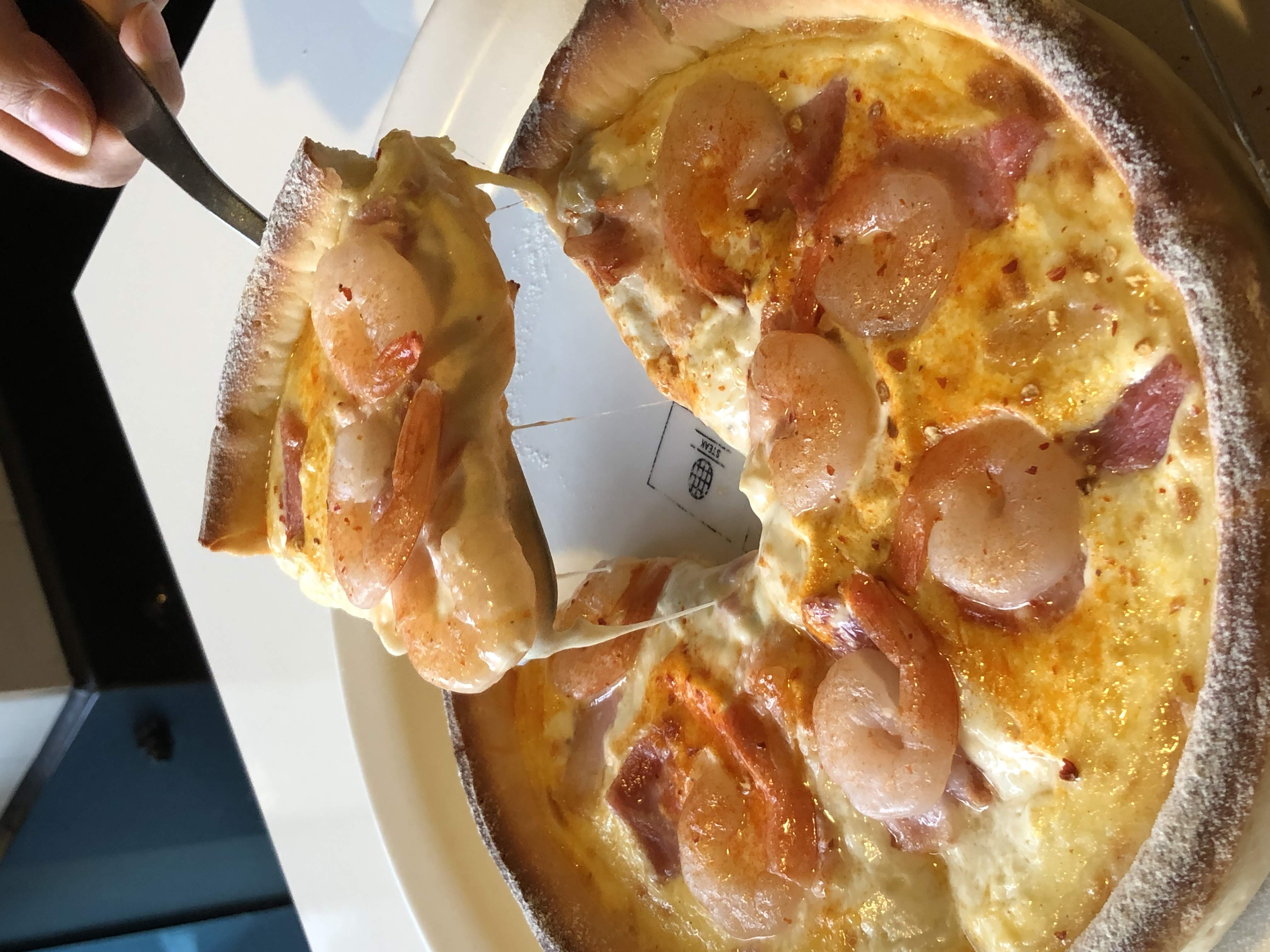 시카고 쉬림프 피자는 두툼한 도우에 풍성한 치즈가 들어있는 전형적인 시카고 스타일 피자입니다. 토핑으로는 칵테일 새우 크기의 통통한 새우가 올라가 있고 매운 맛을 더하는 시즈닝도 더해져 느끼한 맛을 잡아줍니다. 전반적으로 맛은 뛰어난 편입니다. 다만 새우 이외에 다른 토핑이 없어 조금은 심심한 느낌이 있습니다.