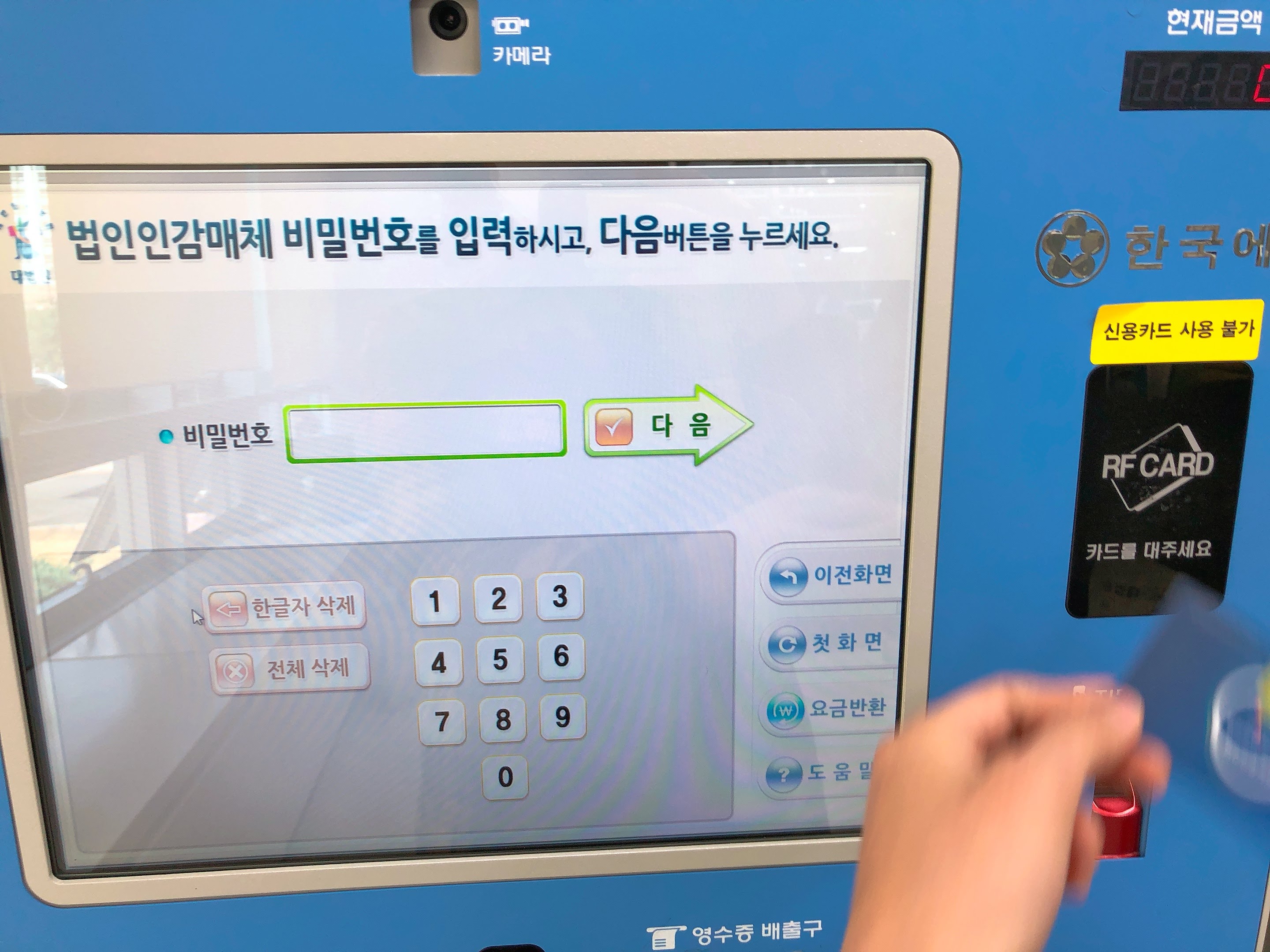 사진에서 제 손이 향하는 곳에 RF카드 인식부가 있습니다. 이곳에 RF방식 인감카드를 대주면 법인인감매체 비밀번호 입력 단계로 넘어가게 됩니다. 법인인감매체 비밀번호를 누르고 다음 버튼을 터치하면 됩니다.