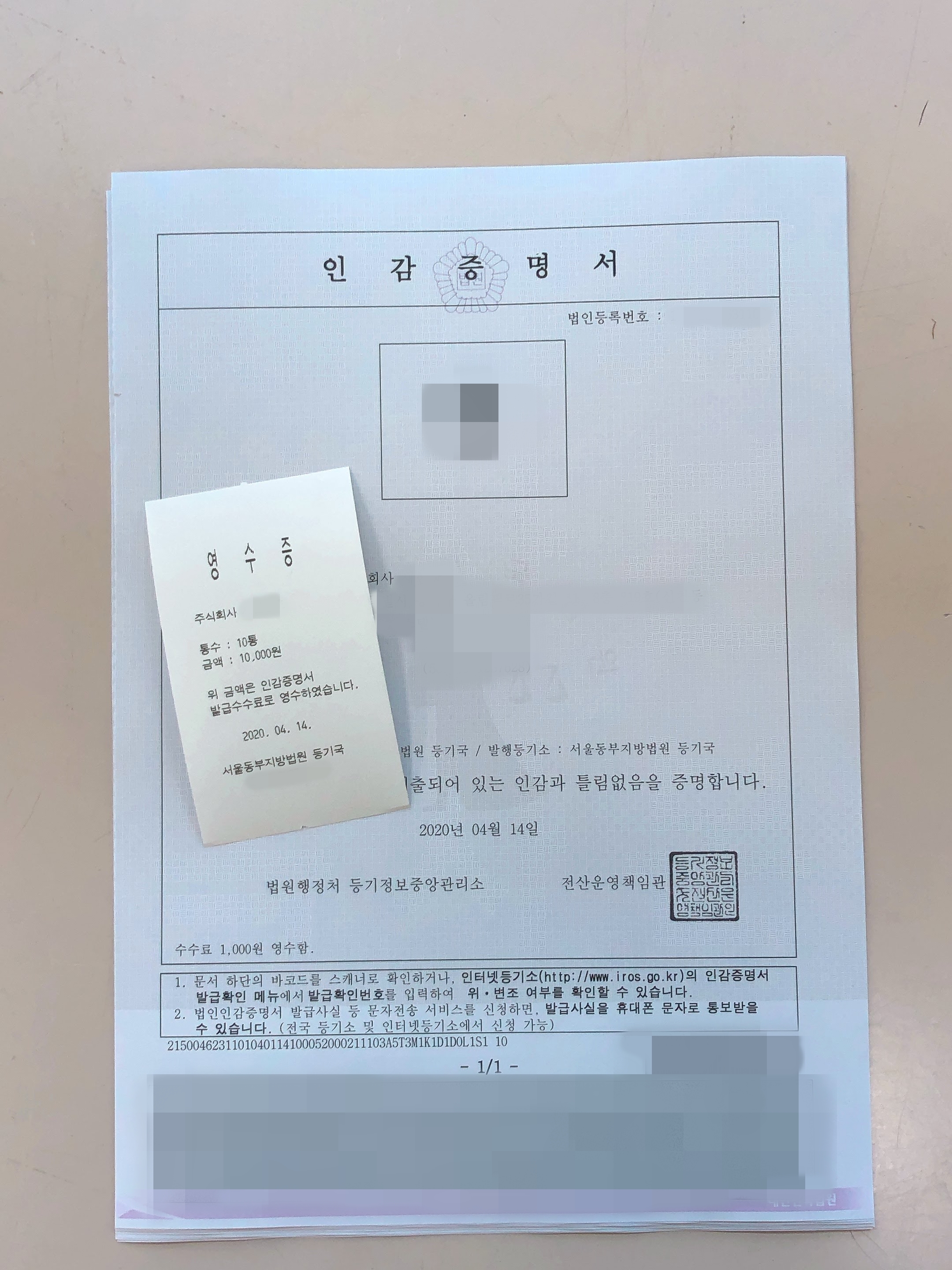 법인인감증명서 출력이 완료되고 나면 마지막으로 수수료 영수증이 출력됩니다. 영수증의 재발급이 불가능하므로 잘 챙기시기 바랍니다.