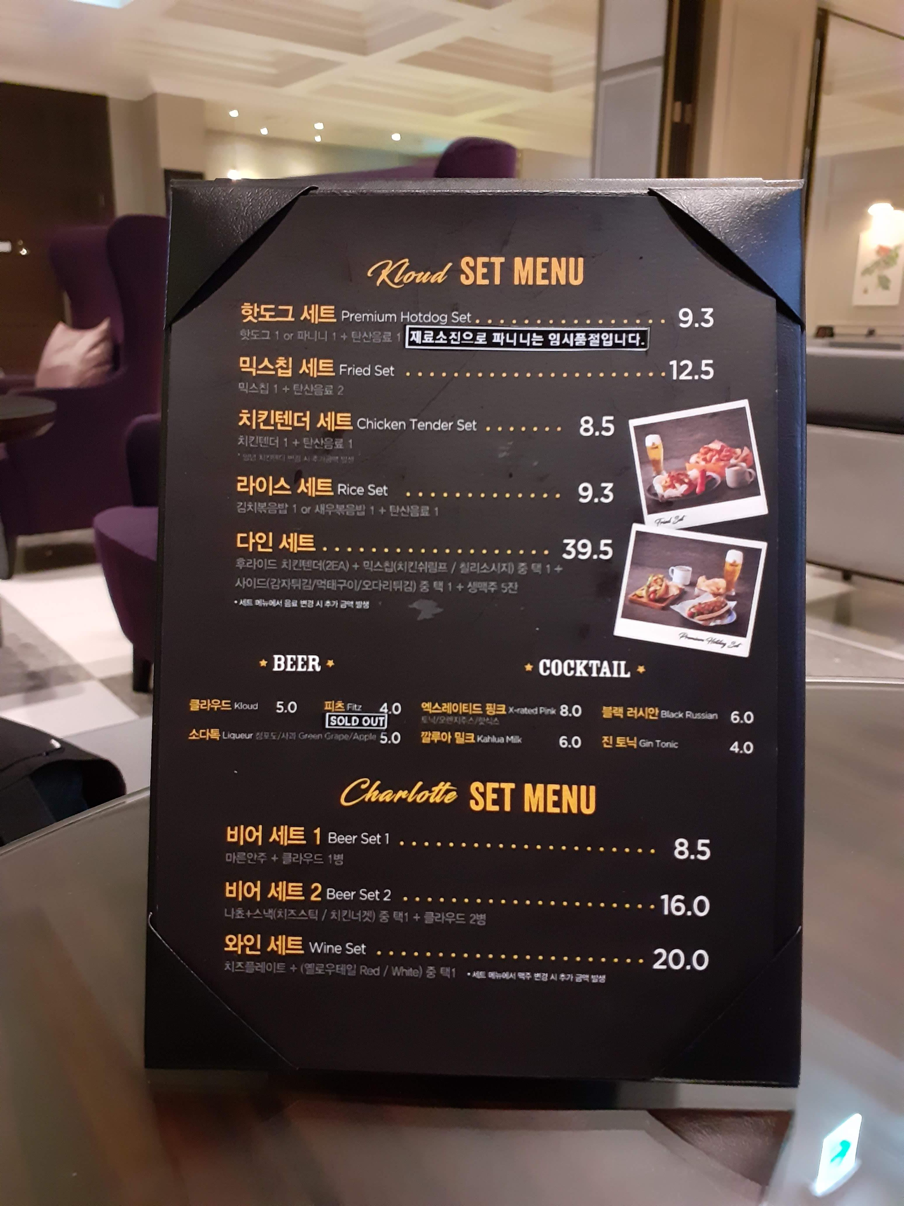 주문한 메뉴가 나오길 기다리며 뒷면을 보니 세트 메뉴도 준비되어 있었습니다. 클라우드 세트는 앞서 보았던 메뉴 + 탄산음료/맥주 구성이 가능하며 샤롯데 세트는 맥주 또는 와인과 함께 즐기는 안주를 주문할 수 있습니다.