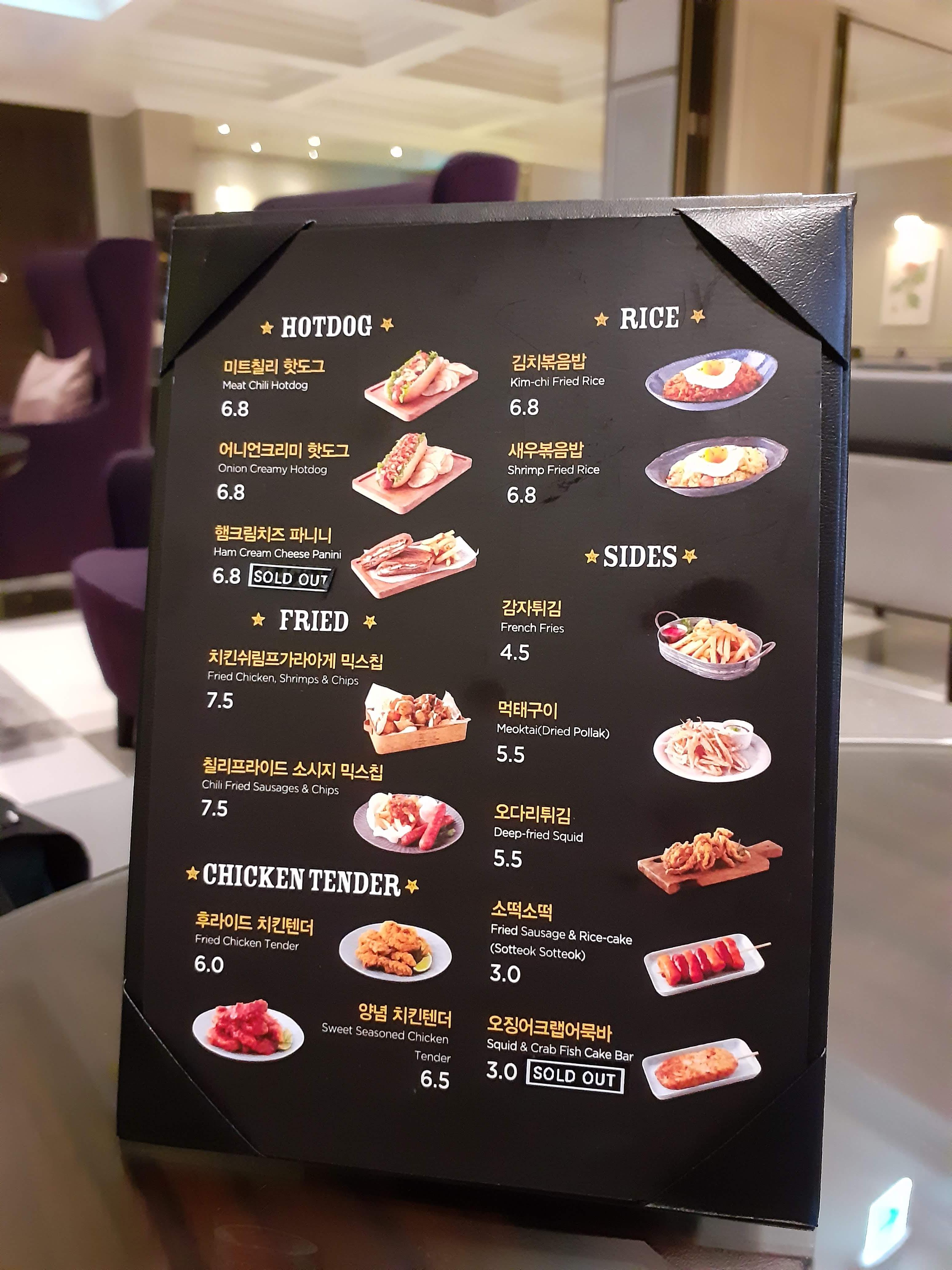 메뉴판은 카운터 및 각 좌석에 마련되어 있습니다. 앞면은 핫도그, 볶음밥 등을 비롯한 간식 메뉴입니다. 얼핏 보면 영화관이 아니라 분식집 메뉴판에 가깝다고 할만큼 다양한 메뉴가 특징입니다. 저희 일행은 앞서 말씀드렸듯 식사를 못한 상태여서 김치볶음밥과 어니언크리미 핫도그를 주문했습니다.